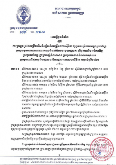 សេចក្តីជូនដំណឹងស្តីពី ការប្រឡងប្រជែងជ្រើសរើសនិស្សិត និងមន្ត្រីរាជការស៊ីវិលឱ្យចូលបម្រើការងារក្នុងក្របខ័ណ្ឌក្រសួងកសិកម្ម រុក្ខាប្រមាញ់ នេសាទ និងក្រសួង ស្ថាប័នរដ្ឋ សម្រាប់ឆ្នាំ២០២១