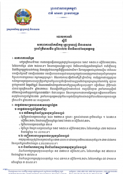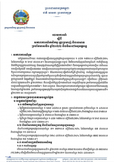 របាយការណ៍ស្តីពី សភាពការណ៍កសិកម្ម រុក្ខាប្រមាញ់ និងនេសាទប្រចាំឆមាសទី០១ ឆ្នាំ២០២២ និងទិសដៅអនុវត្តបន្ត