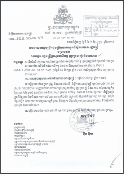 ករណីសំណើសុំគោលការណ៍អនុញ្ញាតដាក់សមត្ថកិច្ចពាក់ព័ន្ធ ចូលរួមត្រួតពិនិត្យអនាម័យ និងភូតគាមអនាម័យ លើផលិតផលកសិកម្ម ជលផល និងសត្វនៅតាមច្រកនាំចេញ នាំចូល