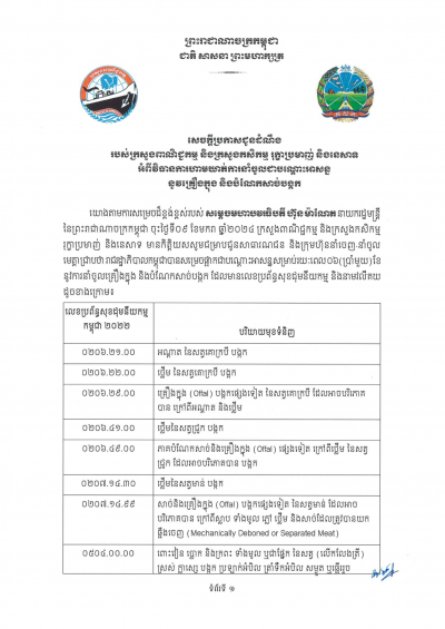 សេចក្តីប្រកាសជូនដំណឹងរបស់ក្រសួងពាណិជ្ជកម្ម និងក្រសួងកសិកម្ម រុក្ខាប្រមាញ់ និងនេសាទ អំពីវិធានការហាមឃាត់ការនាំចូលជាបណ្តោះអាសន្ន នូវគ្រឿងក្នុង និងបំណែកសាច់បង្កក