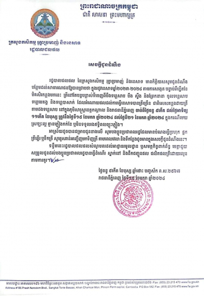 សេចក្តីជូនដំណឹងរបស់រដ្ឋបាលជលផល ស្តីពីរដូវបើកនេសាទ ឆ្នាំ២០២៣-២០២៤