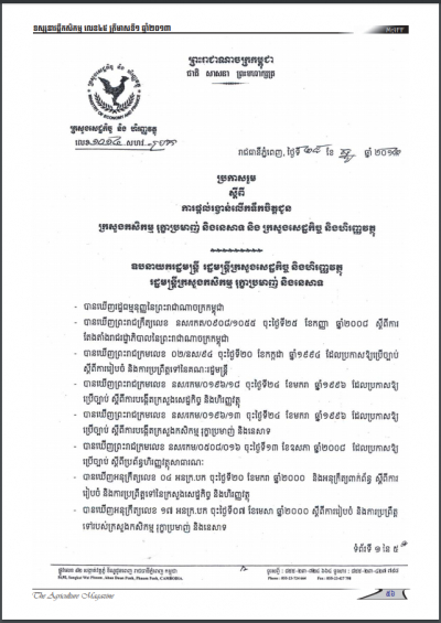 ប្រកាសរួមស្តីពីការប្រមូលកម្រៃសេវាកម្មត្រួតពិនិត្យអនាម័យសត្វ សាច់ និងផលិតផលសត្វ នៅសត្តឃាតដ្ឋាន