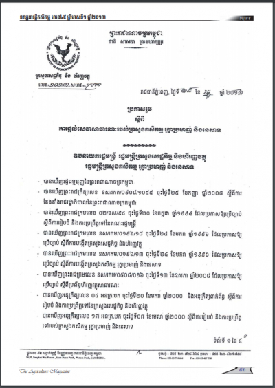 ប្រកាសរួមស្តីពីការផ្តល់រង្វាន់លើកទឹកចិត្តជូនក្រសួងកសិកម្ម រុក្ខាប្រមាញ់ និងនេសាទ