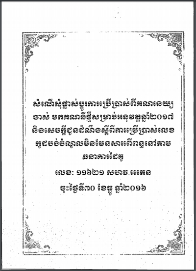 សំណើសុំផ្លាស់ប្តូរការប្រើប្រាស់ពីគណនេយ្យចាស់ មកគណនីថ្មីសម្រាប់អនុវត្តឆ្នាំ២០១៧ និងសេចក្តីជូនដំណឹងស្តីពីការប្រើប្រាស់លេខកូដបង់ចំណូលមិនមែនសារពើពន្ឋនៅតាមធានាគារដៃគូ
