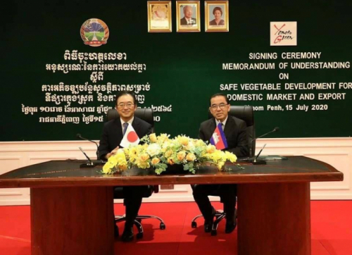 នៅទីស្តីការក្រសួងកសិកម្មរុក្ខាប្រមាញ់និងនេសាទនាព្រឹកថ្ងៃពុធ១០រោចខែអាសាឍឆ្នាំជូតទោស័កព.ស.២៥៦៤ត្រូវនឹងថ្ងៃទី១៥ខែកក្កដាឆ្នាំ២០២០មានរៀបចំពិធីចុះហត្ថលេខាលើអនុស្សរណនៃការយោគយល់គ្នាស្តីពី"ការអភិវឌ្ឍបន្លែសុវត្ថិភាពសម្រាប់ទីផ្សារក្នុងស្រុកនិងការនាំចេញ"រវាងក្រសួងកសិកម្មរុក្ខាប្រមាញ់និងនេសាទជាមួយក្រុមហ៊ុនYamato...