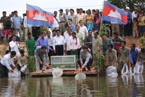 កូនត្រីចំនួនមួយម៉ឺនក្បាល មេត្រីពូជចំនួន៤០គីឡូក្រាម បានត្រូវលែង នៅទំនប់ស្ពានពីរក្នុងឃុំត្រាំកក់ ស្រុកត្រាំកក់ កាលពីពេលថ្មីៗនេះ។ ជាមួយគ្នាកសិករចំនួន៧០គ្រួសារ...