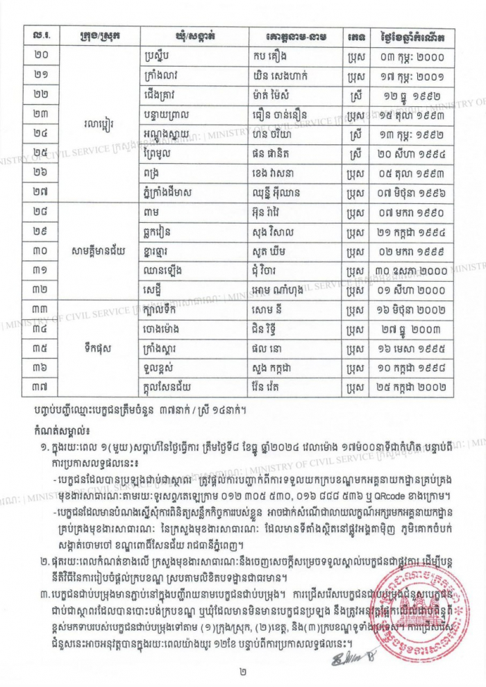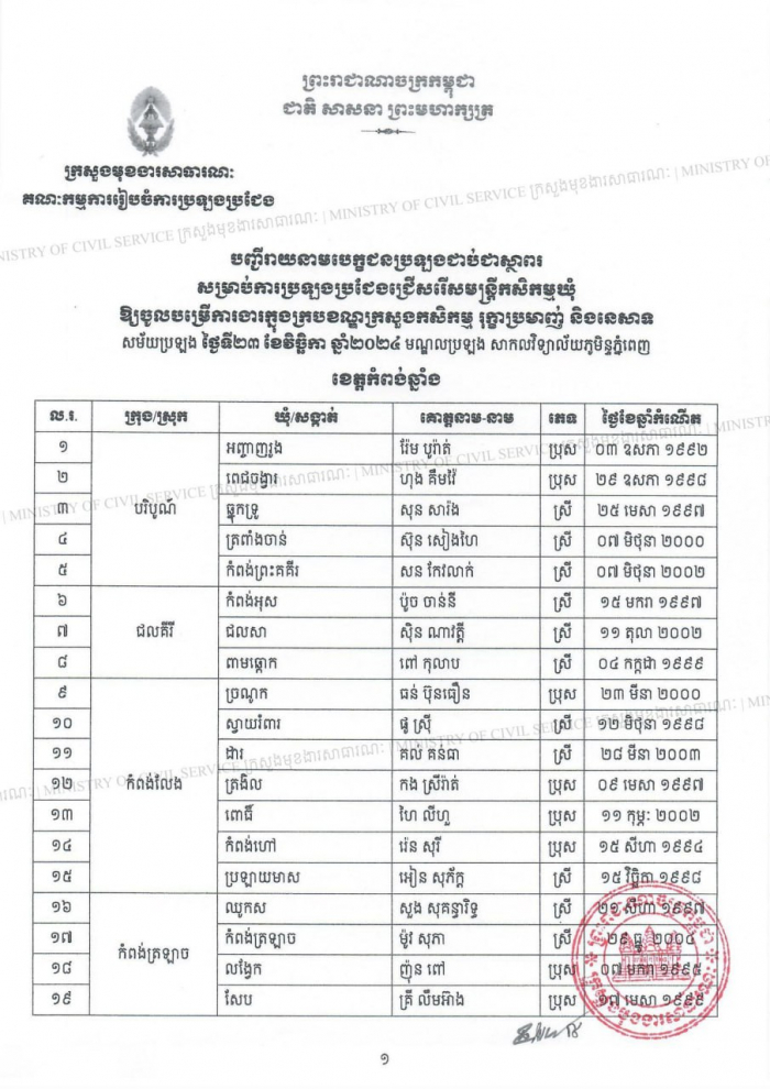 បញ្ជីរាយនាម បេក្ខជនប្រឡងជាប់ជាស្ថាពរនៃការប្រឡងប្រជែងជ្រើសរើសមន្ត្រីកសិកម្មឃុំ ឱ្យចូលបម្រើការងារក្នុងក្របខណ្ឌក្រសួងកសិកម្ម រុក្ខាប្រមាញ់ និងនេសាទ ខេត្តកំពង់ឆ្នាំង