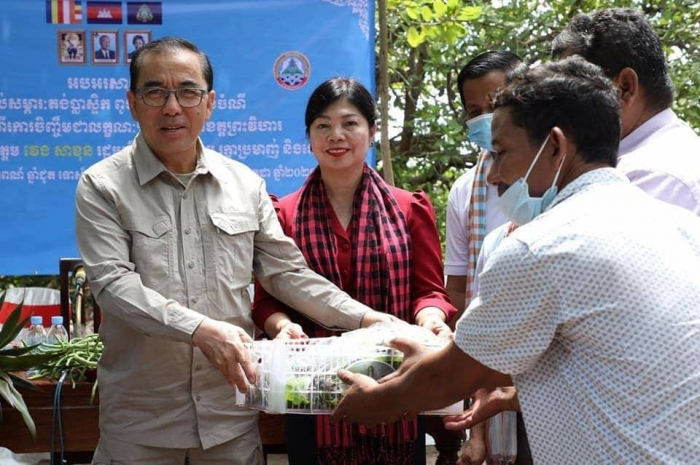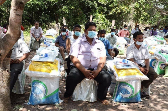ឆ្លៀតក្នុងឱកាសនេះ ឯកឧត្តមរដ្ឋមន្រ្តី វេង សាខុន បានសម្តែងនូវសេចក្តីសោមនស្សរីករាយដែលបានមកជួបសំណេះសំណាលជាមួយបងប្អូនប្រជាកសិករ ហើយឯកឧត្តមរដ្ឋមន្រ្តី ក៏បានពាំនាំនូវបណ្តាំផ្ញើសាកសួរសុខទុក្ខដល់ប្រជាកសិករទាំងអស់ ពីសំណាក់សម្តេចតេជោ នាយករដ្ឋមន្រ្តី និងសម្តេចកត្តិព្រឹទ្ធបណ្ឌិត ដែលលោកទាំងពីរតែងតែនឹករលឹក និងខ្វល់ខ្វាយពីសុខទុក្ខរបស់បងប្អូនប្រជាពលរដ្ឋនៅគ្រប់ទិសទី។ នៅក្នុងបរិការណ៍នៃបញ្ហារាលដាលជំងឺកូវីដ ១៩នេះ ដើម្បីធានាសន្តិសុខស្បៀង បង្កើនឱកាសការងារ និងប្រាក់ចំណូលជូនប្រជាកសិករ សម្តេចតេជោ នាយករដ្ឋមន្រ្តី បានដាក់ចេញនូវយុទ្ធនាការជំរុញការអនុវត្តសកម្មភាពវារីវប្បកម្មនៅទូទាំងប្រទេស ជាក់ស្តែងនៅព្រឹកនេះក្រសួងកសិកម្ម រុក្ខាប្រមាញ់ និងនេសាទបាននាំយកមកនូវ សម្ភា:មួយចំនួនដើម្បីចែកជូនកសិករជានិម្មិតរូបចំនួន ៥០គ្រួសារ ដោយមួយគ្រួសារទទួលបាន កូនត្រីអណ្តែង ៧០០ក្បាល ឬកូនកង្កែប ៤០០ក្បាល និងចំណីចំនួន ១០០គីឡូក្រាម។ ឯកឧត្តមរដ្ឋមន្រ្តី ក៏បានលើកទឹកចិត្តដល់កសិករគ្រប់រូបខិតខំប្រឹងប្រែងក្នុងការចិញ្ចឹមដើម្បីធានាការផ្គត់ផ្គង់ទីផ្សាររបស់យើងឱ្យបានពេញលេញ ហើយឯកឧត្តមរដ្ឋមន្រ្តី ក៏បានណែនាំដល់មន្ទីរកសិកម្ម រុក្ខាប្រមាញ់ និងនេសាទ និងអាជ្ញាធរខេត្ត មេត្តាផ្តល់ការគាំទ្របច្ចេកទេសឱ្យបានពេញលេញ និងតាមដានពិនិត្យក្នុងករណីកសិករជួបបញ្ហាប្រឈមនានា ដើម្បីដោះស្រាយបានទាន់ពេលវេលា ហើយក៏ត្រូវរៀបចំយន្តការដោះស្រាយទីផ្សារជូនកសិករ ជៀសវាងបញ្ហាអស្ថេរភាពតម្លៃ។
