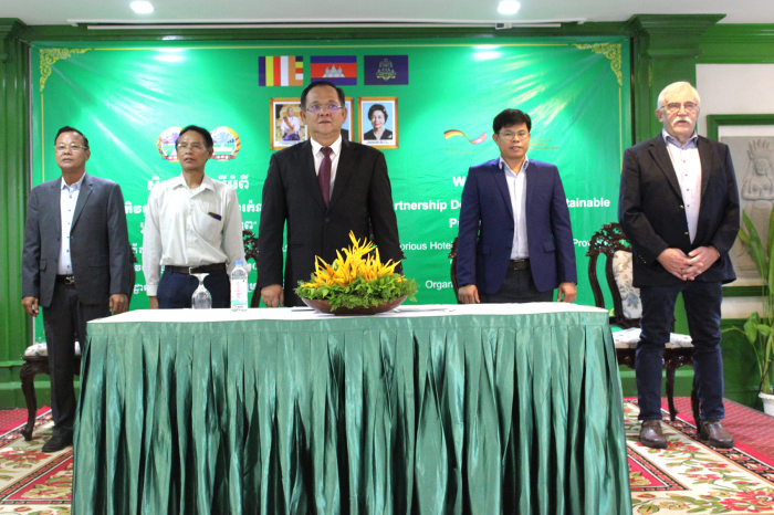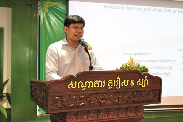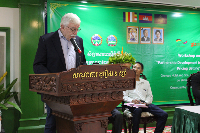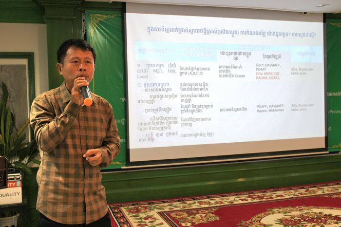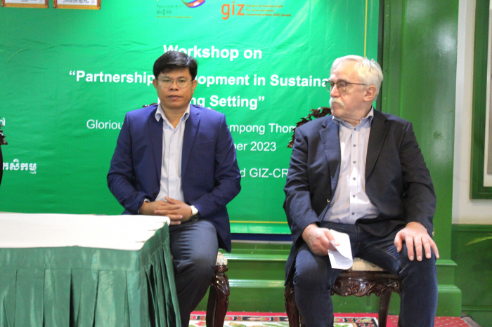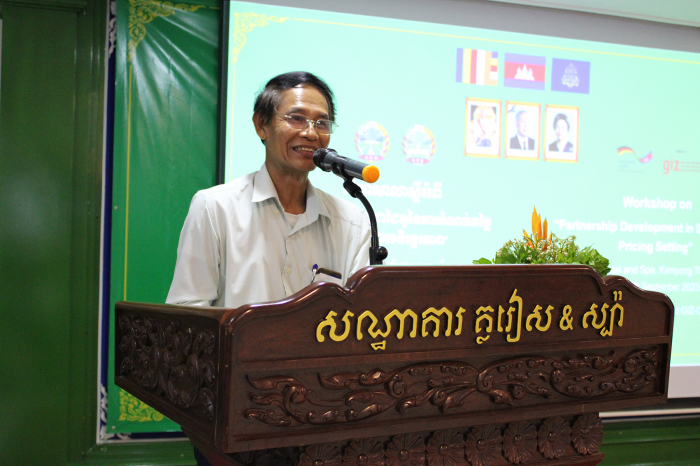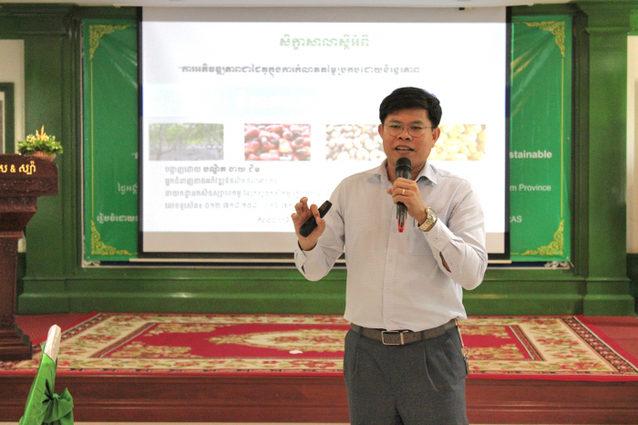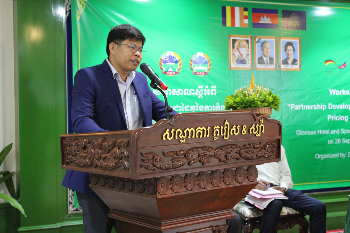 ថ្ងៃអង្គារ ១២កើត ខែភទ្របទ ឆ្នាំថោះ បញ្ចស័ក ព.ស. ២៥៦៧ ត្រូវនឹងថ្ងៃទី២៦ ខែកញ្ញា ឆ្នាំ២០២៣ នាយកដ្ឋានកសិ-ឧស្សាហកម្ម នៃក្រសួងកសិកម្ម រុក្ខាប្រមាញ់ និងនេសាទ សហការជាមួយភ្នាក់ងារកិច្ចសហប្រតិបត្តិការអន្តរជាតិអាល្លឺម៉ង់ប្រចាំនៅកម្ពុជា(GIZ) បានរៀបចំសិក្ខាសាលាស្តីពី “ការអភិវឌ្ឍភាពជាដៃគូក្នុងការកំណត់តម្លៃប្រកបដោយនិរន្តរភាព” ក្រោមអធិបតីភាព ឯកឧត្តម អ៊ួង កុសល រដ្ឋលេខាធិការក្រសួងកសិកម្ម រុក្ខាប្រមាញ់ និងនេសាទ នៅសណ្ណាគារគ្លរៀស ខេត្តកំពង់ធំ ដោយមានការអញ្ជើញចូលរួមពីមន្ទីរកសិកម្ម រុក្ខាប្រមាញ់ និងនេសាទចំនួន ១១ខេត្ត សហព័ន្ធស្វាយចន្ទី សមាគមស្វាយចន្ទី សហគមន៍កសិកម្ម វិស័យឯកជន និងដៃគូអភិវឌ្ឍន៍នានា សរុបចំនួន ៥០រូប។ សិក្ខាសាលានេះមានគោលបំណងគឺ៖ (១)ពង្រឹងសមត្ថភាពរបស់ភាគីពាក់ព័ន្ធ និងអ្នកពាក់ព័ន្ធដូចជា មន្ទីរកសិកម្ម រុក្ខាប្រមាញ់ និងនេសាទ(ការិយាល័យកសិ-ឧស្សាហកម្ម) វិស័យឯកជន និងសហគមន៍កសិកម្មដែលបានអនុវត្តផលិតកម្មកសិកម្មតាមកិច្ចសន្យា (២)បង្កើនចំណេះដឹងរបស់អ្នកពាក់ព័ន្ធ និងតួអង្គពាក់ព័ន្ធលើស្តង់ដារគុណភាពគ្រាប់ស្វាយចន្ទីស្រស់ ដើម្បីជួយសម្រួលដល់ការកំណត់តម្លៃសមស្រប និងមានតម្លាភាព និង(៣)បង្កើតភាពជាដៃគូដើម្បីផ្សារភ្ជាប់គម្លាតរវាងភាគីពាក់ព័ន្ធនៅថ្នាក់ជាតិ និងថ្នាក់ខេត្ត ដូចជា នាយកដ្ឋានកសិឧស្សាហកម្ម មន្ទីរកសិកម្ម រុក្ខាប្រមាញ់ និងនេសាទ វិស័យឯកជន/អ្នកកែច្នៃ និងសហគមន៍កសិកម្មដើម្បីពង្រឹងការអនុវត្តផលិតកម្មកសិកម្មតាមកិច្ចសន្យា។