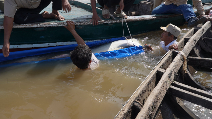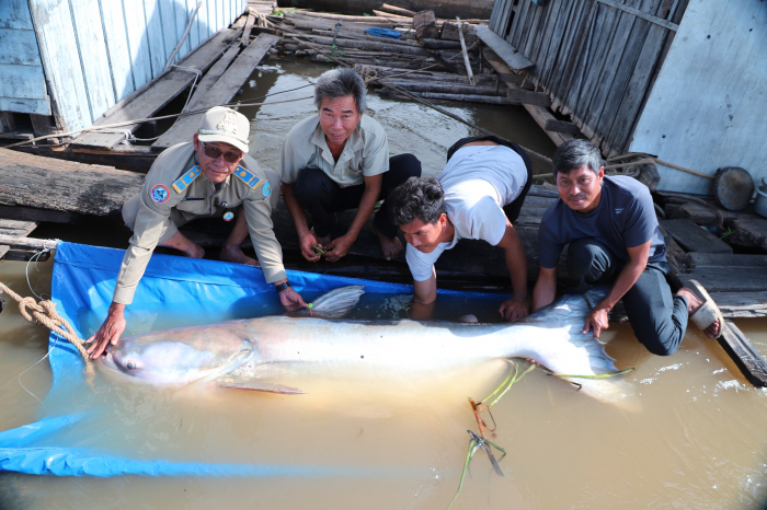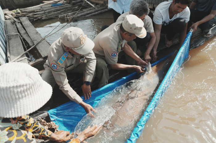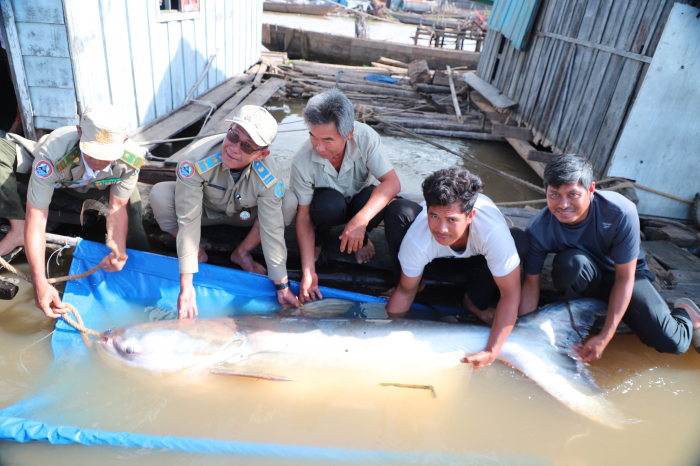 ត្រីរាជមួយក្បាល ទម្ងន់១៣២គីឡូក្រាម ដែលចាប់បានដោយអ្នកនេសាទ ទទួលបានការជួយសង្គ្រោះ និងលែងចូលបឹងធម្មជាតិវិញ