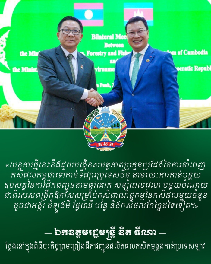 កិច្ចព្រមព្រៀងស្តីពីការដឹកជញ្ជូនកសិផលឆ្លងកាត់(Transit) ដែលទើបចុះហត្ថលេខានៅចំពោះមុខរដ្ឋមន្ត្រីកសិកម្មឡាវនិងកម្ពុជាកាលពីព្រឹកមិញនេះ នឹងបើកផ្លូវឱ្យកម្ពុជាអាចដឹកជញ្ជូនកសិផលទៅកាន់ទីផ្សារប្រទេសចិនតាមផ្លូវគោក ដោយឆ្លងកាត់ទឹកដីឡាវជាផ្លូវការក្នុងពេលដ៏ឆាប់ខាងមុខនេះ។ នេះគឺជាសមិទ្ធផលថ្មីមួយក្នុងការបង្កើនការតភ្ជាប់ក្នុងតំបន់ ដែលកើតចេញពីកិច្ចសហប្រតិបត្តិការយ៉ាងជិតស្និទ្ធរវាងក្រសួងកសិកម្មនៃប្រទេសទាំង២៕