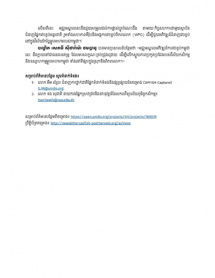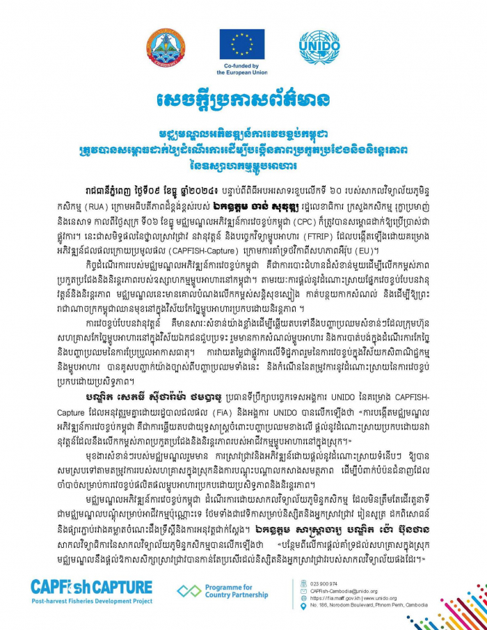 សេចក្ដីប្រកាសព័ត៌មានរួម ស្ដីពី «ការបង្កើតមជ្ឈ មណ្ឌលអភិវឌ្ឍន៍ ការវេចខ្ចប់កម្ពុជា(CPC)» ត្រូវបាន សម្ពោធដាក់ឱ្យដំណើរការ ដើម្បីបង្កើនភាពប្រកួត ប្រជែង និងនិរន្តរភាព នៃឧស្សាហកម្មម្ហូបអាហារ។គោលបំណងលើកកម្ពស់សន្តិសុខស្បៀង កាត់បន្ថយ កាកសំណល់ និងដើម្បីឱ្យព្រះរាជាណាចក្រកម្ពុជា ឈានមុខនៅក្នុងវិស័យកែច្នៃម្ហូបអាហារប្រកប ដោយនិរន្តភាព។