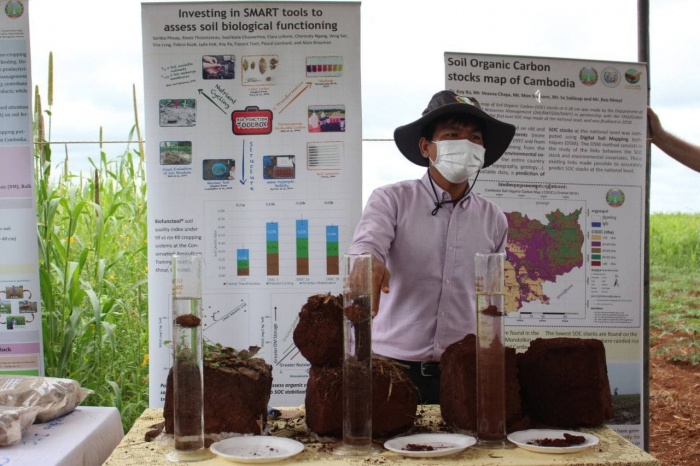 លោកបណ្ឌិត Florent TIVET និងលោកឡេង វីរ៉ា បានបង្ហាញជូនភ្ញៀវនូវសកម្មភាពសំខាន់ៗដែលបាននិងកំពុងអនុវត្តនៅក្នុងស្ថានីយ៍ពិសោធន៍កសិកម្មអភិរក្សបុសខ្នុរ រួមមាន៖ ១). គំរូប្រព័ន្ធកសិកម្មសរីរាង្គជាមូលដ្ឋានដោយរក្សាការមិនភ្ជួរ ការរក្សាគម្របដីអចិន្ត្រយ៍ ការដាំដំណាំបង្វិល និងជាពិសេសការអនុវត្តបច្ចេកទេសដាំដុះដំណាំលើគម្របដីស្រស់ មានដូចជាដំណាំពោត សណ្តែកសៀង និងដំឡូងមី ២). ការអភិរក្សនឹងកន្លែងនូវគ្រាប់ពូជដំណាំគម្របដីដែលមានការធ្វើសារពើភ័ណ្ឌសេណេទិចពូជសរុបមានចំនួន៤៤ប្រភេទ ស្មើនឹង២១៦ពូជ។ ពូជដំណាំទាំងនេះ ត្រូវបានប្រើប្រាស់ជាចំណីសត្វ និងជាដំណាំគ្របដី ហើយសព្វថ្ងៃនេះក្រុមហ៊ុន Smart-Agro កំពុងដើរតួនាទីដ៏សំខាន់ក្នុងការផលិតនិងផ្គត់ផ្គង់គ្រាប់ពូជដំណាំគម្របដីទាំងនេះដល់សហគមន៍កសិកម្ម និងកសិករ ៣). ការពិសោធន៍បែបលក្ខណៈវិទ្យាសាស្ត្ររយៈពេលវែង ដោយផ្តោតលើបច្ច័យចំនួន៣នៃប្រព័ន្ធដំណាំជាមូលដ្ឋានសំខាន់ៗដែលកំពុងអនុវត្តនៅតំបន់ខ្ពង់រាបរួមមានដំណាំដំឡូងមី ពោត និងសណ្តែកសៀង។ ការពិសោធន៍នេះ បានផ្តល់ឱកាសឱ្យនិស្សិតថ្នាក់បរិញ្ញាបត្រ បរិញ្ញាបត្រជាន់ជាន់ខ្ពស់ និងថ្នាក់បណ្ឌិតវិទ្យាសាស្ត្រ ដែលមានការចាប់អារម្មណ៍ក្នុងការងារស្រាវជ្រាវអំពីកសិកម្មអភិរក្សមកធ្វើការសិក្សាដើម្បីបញ្ចប់ការសិក្សារបស់ពួកគេ ៤). ស្រែបង្ហាញខ្នាតធំដែលបង្កើតឡើងសម្រាប់បង្ហាញប្រៀបធៀបអំពីគុណសម្បត្តិរវាងកសិកម្មអភិរក្ស និងការអនុវត្តកសិកម្មតាមទម្លាប់របស់កសិករ ៥). ការប្រើប្រាស់គ្រឿងយន្តកសិកម្មសម្រាប់បម្រើឱ្យការអនុវត្តកសិកម្មអភិរក្ស គឺជាធាតុចូលមួយដ៏សំខាន់បំផុតដែលមិនអាចខ្វះបានដូចជាប្រព័ន្ធឧបករណ៍ដាំគ្រាប់ស្ងួតលើគម្របដីស្រស់ ឧបករណ៍ដាំដំណាំដំឡូងមីលើដីមិនភ្ជួរ និងឧបករណ៍ប្រមូលផលដំណាំដំឡូងមីជាដើម ៦). គំរូផ្សព្វផ្សាយអំពីសេវាកម្មកសិកម្មអភិរក្ស “មិត្តកសិករ” ដែលជាគំរូមួយដែលមានការចូលរួមពីភាគីពាក់ព័ន្ធសំខាន់ៗរួមមាន ស្ថាប័នរដ្ឋ វិស័យឯកជន ក្រុមកសិករស្ម័គ្រចិត្ត និងកសិករទូទៅ ក្នុងគោលបំណងជំរុញការអនុវត្តកសិកម្មអភិរក្សឱ្យបានកាន់តែទូលំទូលាយបន្ថែមទៀត ៧). ការបង្ហាញអំពីដំណើរនៃការចែកចាយ និងផ្គត់ផ្គង់គ្រាប់ពូជដំណាំគម្របដីរបស់ក្រុមហ៊ុន Smart-Agro និង៨). ការបង្ហាញប្រៀបធៀបអំពីគុណភាពដីតាមរយៈកម្រិតនៃភាពរឹងមាំនៃបង្គុំគ្រាប់ដី (Soil aggregates) រវាងដីព្រៃធម្មជាតិ ដីដែលអនុវត្តកសិកម្មតាមទម្លាប់ (ភ្ជួរគ្មានគម្របដី) និងដីដែលអនុវត្តកសិកម្មអភិរក្ស គឺបង្ហាញឱ្យឃើញថា ដីព្រៃធម្មជាតិ និងដីដែលអនុវត្តកសិកម្មអភិរក្ស គឺមានបង្គុំគ្រាប់ដីរឹងមាំល្អប្រសើរជាងដីដែលអនុវត្តកសិកម្មតាមទម្លាប់។ដំណើរទស្សនកិច្ចទីវាលនិងកិ