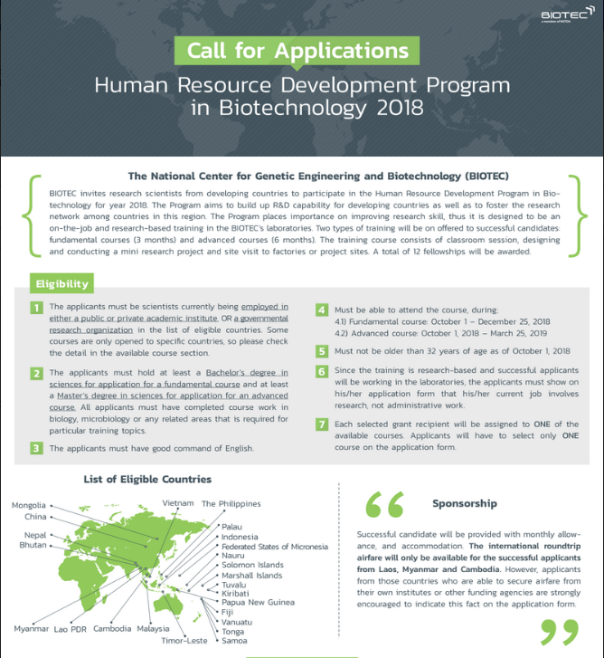 It is my pleasure to announce the Human Resource Development Program in Biotechnology, which will provide fellowshipsforlab/research training at the National CenterforGenetic Engineering and Biotechnology (BIOTEC), Thailandforyear 2018. The Announcements,applicationform and more detail of the program are attached herewith. This information can also be found on BIOTEC website athttps://www.biotec.or.th/ENor download athttps://goo.gl/Y2zwsm. I would...