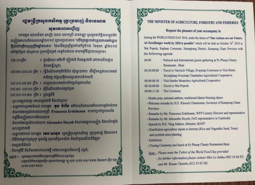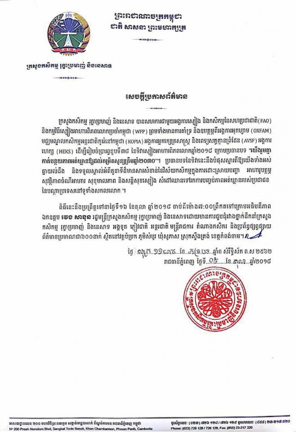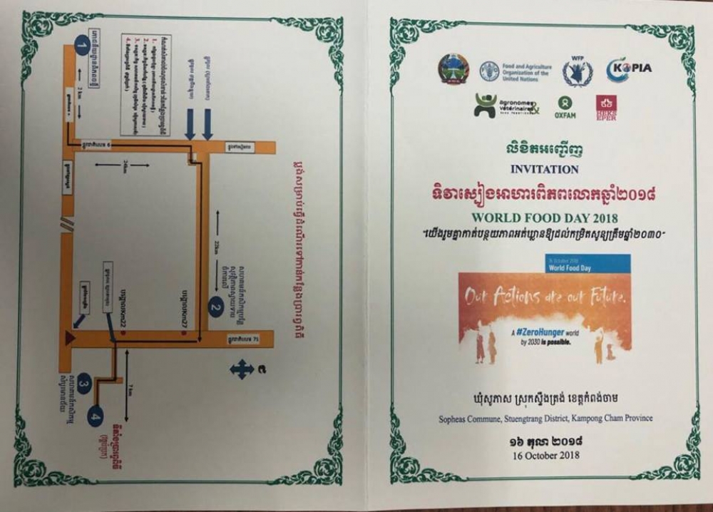 ក្រសួងកសិកម្ម រុក្ខាប្រមាញ់​ និងនេសាទ បានសហការជាមួយអង្គការស្បៀង និងកសិកម្មនៃសហប្រជាជាតិ(FAO) និងកម្មវិធីស្បៀងអាហារពិភពលោកប្រចាំកម្ពុជា (WFP) ព្រមទាំងមានការគាំទ្រ និងឧបត្ថម្ភពីអង្គការអុកហ្វាម (OXFAM)  មជ្ឈមណ្ឌលកសិកម្មអន្តរជាតិកូរ៉េនៅកម្ពុជា (KOPIA) អង្គការអ្នកក្សេត្រសាស្ត្រ និងពេទ្យសត្វគ្មាន     ព្រំដែន (AVSF) អង្គការហេក្ស (HEKS) ដើម្បីរៀបចំប្រារព្ធខួបទី៣៨ នៃទិវាស្បៀងអាហារពិភពលោកឆ្នាំ២០១៨​ ក្រោមប្រធានបទ យើងរួមគ្នាកាត់បន្ថយភាពអត់ឃ្លានឲ្យដល់កម្រិតសូន្យត្រឹមឆ្នាំ២០៣០។ គោលបំណងដើម្បីបំផុសស្មារតីឲ្យយើងទាំងអស់គ្នាយល់ដឹង និងទទួលស្គាល់អំពីតួនាទីដ៏មានសារៈសំខាន់នៃវិស័យកសិកម្មក្នុងការដោះស្រាយបញ្ហា អាហាររូបត្ថម្ភ សុវត្ថិភាពចំណីអាហារ សុខុមាលភាព និងសន្តិសុខស្បៀង សំដៅឈានទៅរកការបញ្ចប់ភាពអត់ឃ្លានរបស់ប្រជាជននៃបណ្តាប្រទេសទូទាំងសកលលោក។