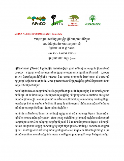 Seoul, Republic of Korea, 20 Oct 2020 – Leaders of the Asian Forest Cooperation Organization (AFoCO), World Agroforestry and Center for International Forestry Research (CIFOR-ICRAF), Global EverGreening Alliance (Alliance) will sign on 22 October a landmark partnership agreement to restore...