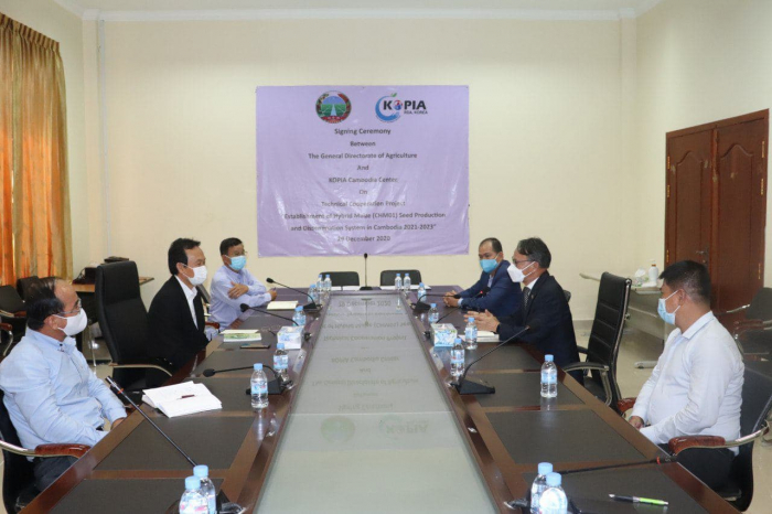 កាលពីថ្ងៃទី២៩ ខែធ្នូ ឆ្នាំ២០២០ នៅអគ្គនាយកដ្ឋានកសិកម្ម មានរៀបចំពិធីចុះហត្ថលេខាលើអនុស្សារណៈនៃការយោគយល់រវាងអគ្គនាយកដ្ឋានកសិកម្ម និងមជ្ឈមណ្ឌល KOPIA ប្រចាំកម្ពុជា លើគម្រោងកិច្ចសហការបច្ចេកទេសស្ដីពី ផលិតកម្ម និងការផ្សព្វផ្សាយគ្រាប់ពូជពោតអ៊ីប្រ៊ីត (CHM01) នៅប្រទេសកម្ពុជា (Establishment of Hybrid Maize (CHM01) Seed Production and Dissemination System in Cambodia) ក្រោមអធិបតីភាពឯកឧត្តមបណ្ឌិត ងិន ឆាយ ប្រតិភូរាជរដ្ឋាភិបាលកម្ពុជាទទួលបន្ទុកជាអគ្គនាយកនៃអគ្គនាយកដ្ឋានកសិកម្ម និងលោកបណ្ឌិត Kim, Yong-Hwan ប្រធានមជ្ឈមណ្ឌល KOPIA ប្រចាំកម្ពុជា។ អញ្ជើញចូលរួមក្នុងពិធីនេះដែរ រួមមាន ថ្នាក់ដឹកនាំអគ្គនាយកដ្ឋានកសិកម្ម ថ្នាក់ដឹកនាំ និងសមាជិកនៃក្រុមការងារអនុវត្តគម្រោង។  គម្រោងនេះមានរយៈពេល០៣ឆ្នាំ ដោយគ្រោងនឹងអនុវត្តចាប់ពីខែមករា ឆ្នាំ២០២១ រហូតដល់ខែធ្នូ ឆ្នាំ២០២៣ ក្រោមគោលបំណងដើម្បី ១). ពង្រឹងសមត្ថភាពរបស់អ្នកសិក្សាស្រាវជ្រាវ និងការបង្កើតពូជពោតអ៊ីប្រ៊ីតថ្មី ២). បង្កើតជាទម្រង់/គម្រូមួយសម្រាប់ផលិតកម្ម និងចែកចាយគ្រាប់ពូជពោតអ៊ីប្រ៊ីត (CHM01) ទៅដល់កសិករ ៣). ធ្វើបង្ហាញពូជពោតអ៊ីប្រ៊ីត (CHM01) ក្នុងទ្រង់ទ្រាយធំនៅតាមបណ្តាខេត្តសំខាន់ៗជាសាធារណៈសម្រាប់ឱ្យកសិករមាន ការយល់ដឹងអំពីប្រភេទពូជពោតអ៊ីប្រ៊ីតដំបូងគេបង្អស់ដែលត្រូវបានបង្កើតឡើងនៅប្រទេសកម្ពុជា និង ៤). អនុវត្តសកម្មភាពនានាដើម្បីបង្កើនការទទួលយករបស់កសិករចំពោះពូជពោតអ៊ីប្រ៊ីត (CHM01) សម្រាប់ប្រើប្រាស់ជាសាធារណៈ។ គម្រោងខាងលើនេះនឹងផ្តោតទៅលើខេត្តមួយចំនួន រួមមាន ខេត្តកណ្តាល (ស្ថានីយកសិកម្មបន្ទាយដែក) និងខេត្តកំពង់ចាម (កសិដ្ឋានផលិតពូជដំណាំតំបន់ដីខ្ពស់ចម្ការលើ) សម្រាប់ជាទីតាំងពិសោធន៍ ស្រាវជ្រាវ និងអភិវឌ្ឍន៍ហេដ្ឋារចនាសម្ព័ន្ធរូបវ័ន្ត និងខេត្តបាត់ដំបង ត្បូងឃ្មុំឬកំពង់ចាម និងកណ្តាល សម្រាប់ជាទីកន្លែងធ្វើបង្ហាញពូជពោតអ៊ីប្រ៊ីត (CHM01) ក្នុងទ្រង់ទ្រាយធំ។ នៅក្នុងពិធីដ៏មានអត្ថន័យនេះ ឯកឧត្តមប្រតិភូ បានថ្លែងអំណរគុណដល់មជ្ឈមណ្ឌល KOPIA ដែលជានិច្ចកាលតែងតែផ្តល់នូវការឧបត្ថម្ភគាំទ្រទាំងលើផ្នែកហិរញ្ញវត្ថុ និងបច្ចេកទេសដើម្បីរួមចំណែកជាមួយរាជរដ្ឋាភិបាលកម្ពុជាក្នុងការអភិវឌ្ឍវិស័យកសិកម្ម ជាពិសេសអនុវិស័យដំណាំកសិកម្មឱ្យមានការរីកចម្រើនជាលំដាប់។ ថ្លែងក្នុងឱកាសនោះដែរ ឯកឧត្តមប្រតិភូបានណែនាំដល់ក្រុមការងារអនុវត្តគម្រោងនេះឱ្យខិតខំ ប្រឹងប្រែង និងយកចិត្តទុកដាក់អនុវត្តសកម្មភាពនានារបស់គម្រោងប្រកបដោយស្មារតីទទួលខុសត្រូវខ្ពស់ និងត្រូវផ្តល់កិច្ចសហការយ៉ាងជិតសិ្នទដើម្បីសម្រេចឱ្យបាននូវលទ្ធផលជាវិជ្ជមាន និងតាមការរំពឹងទុករបស់គម្រោង។