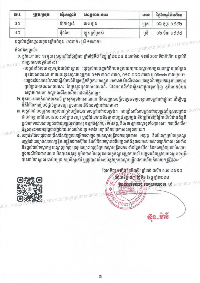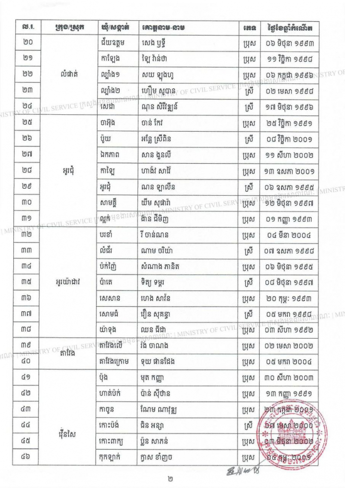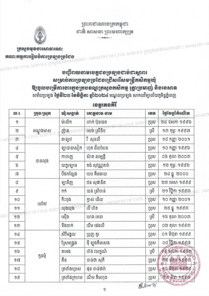បញ្ជីរាយនាម បេក្ខជនប្រឡងជាប់ជាស្ថាពរនៃការប្រឡងប្រជែងជ្រើសរើសមន្ត្រីកសិកម្មឃុំ ឱ្យចូលបម្រើការងារក្នុងក្របខណ្ឌក្រសួងកសិកម្ម រុក្ខាប្រមាញ់ និងនេសាទ ខេត្តរតនគិរី