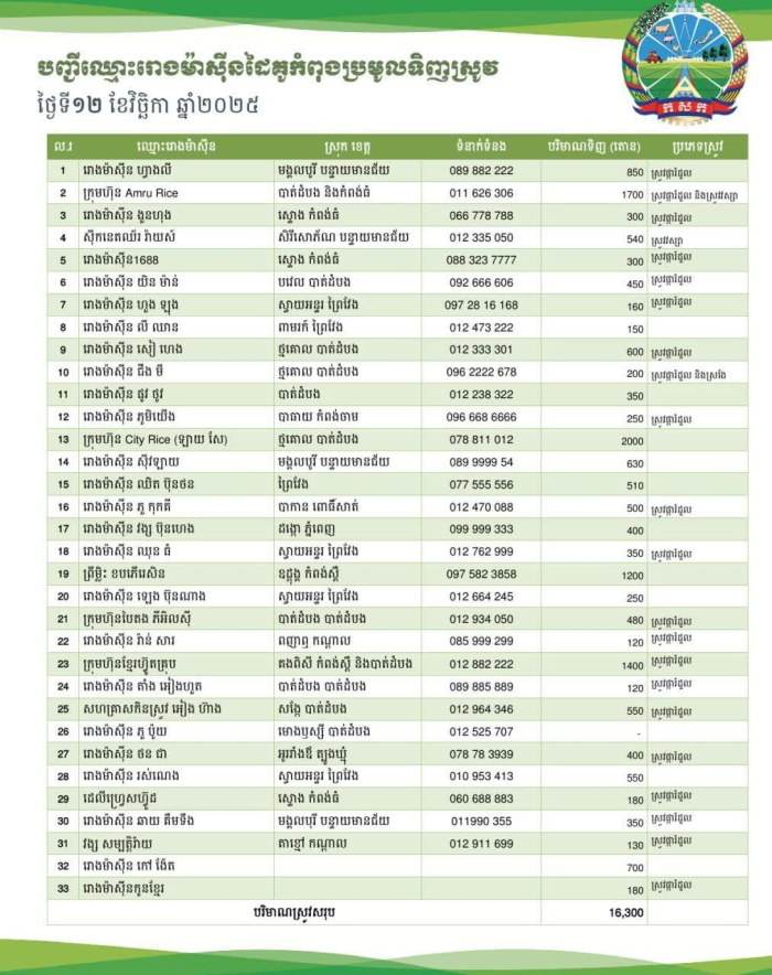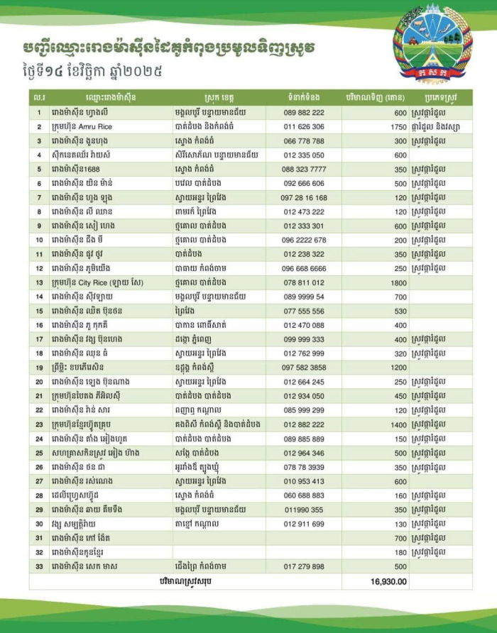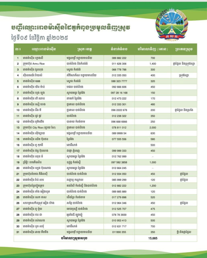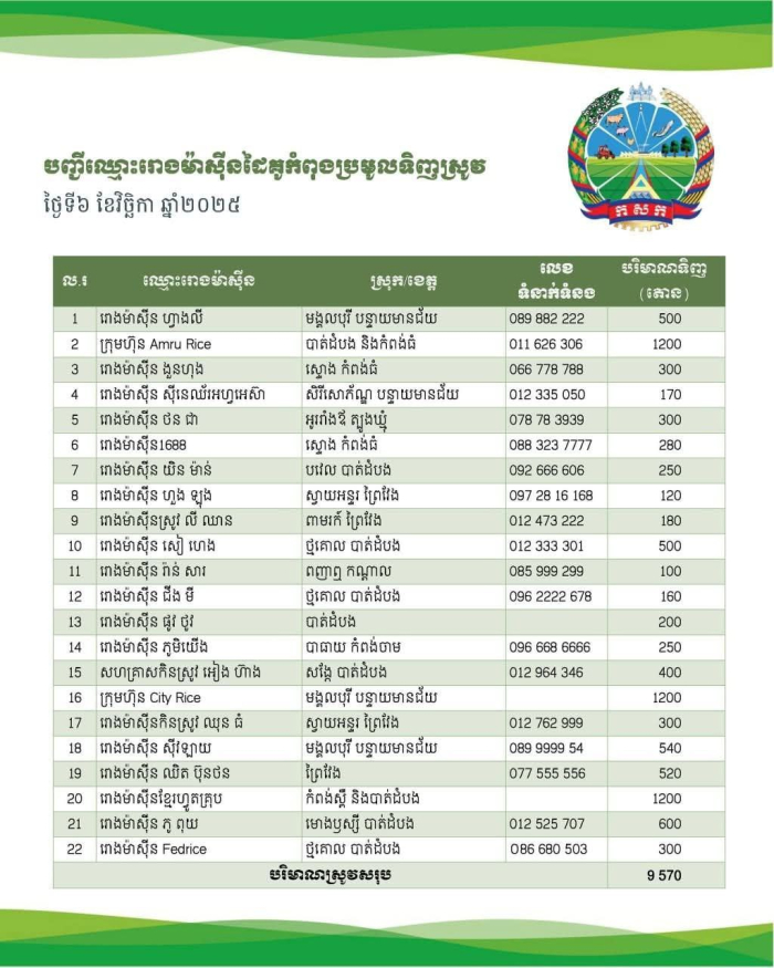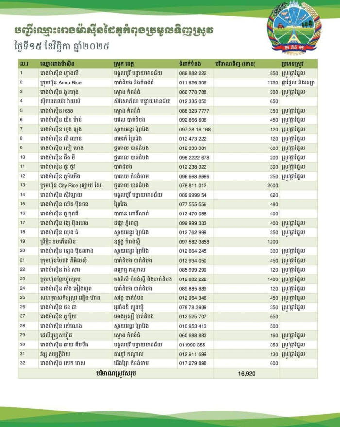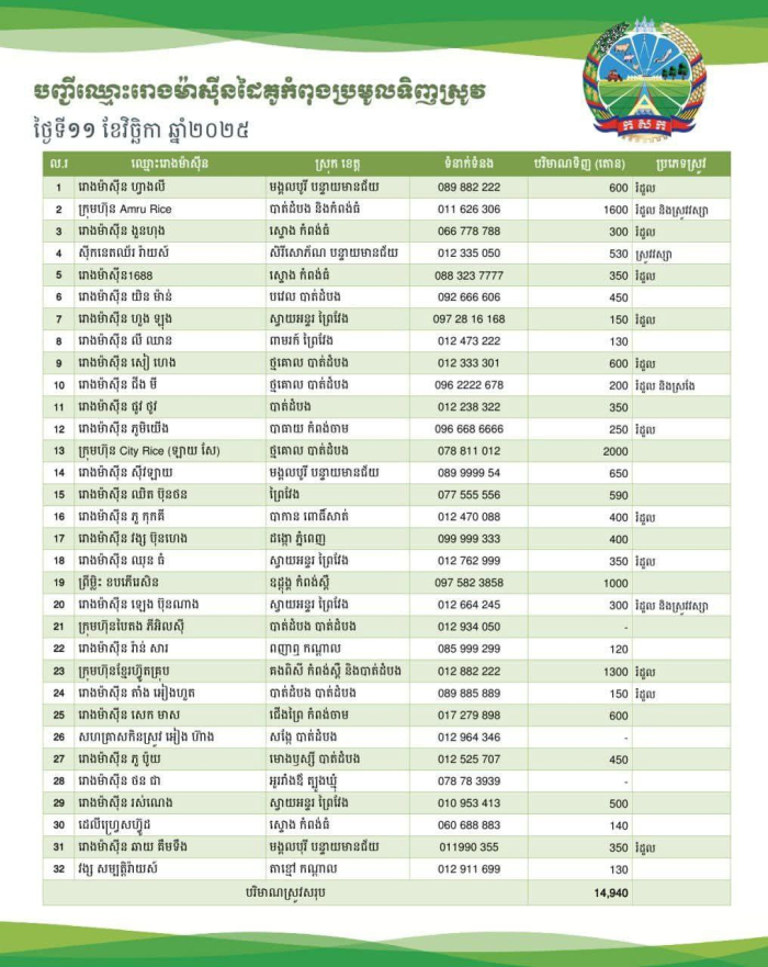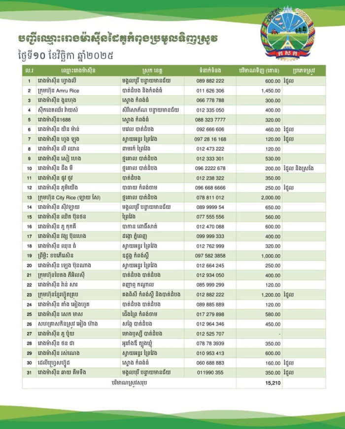 ក្នុងរយៈពេល ១០ ថ្ងៃ ចាប់ពីថ្ងៃទី០៦ ដល់ ថ្ងៃទី ១៥ ខែវិច្ឆិកា ឆ្នាំ២០២៥ រោងម៉ាស៊ីនកិនស្រូវជាដៃគូរបស់ក្រសួងកសិកម្ម រុក្ខាប្រមាញ់ និងនេសាទ បានបន្តប្រមូលទិញស្រូវក្នុងចំនួនកើនឡើងប្រមាណជាង ១៥០ ០០០ តោនពីប្រជាកសិករនៅទូទាំងប្រទេស៕