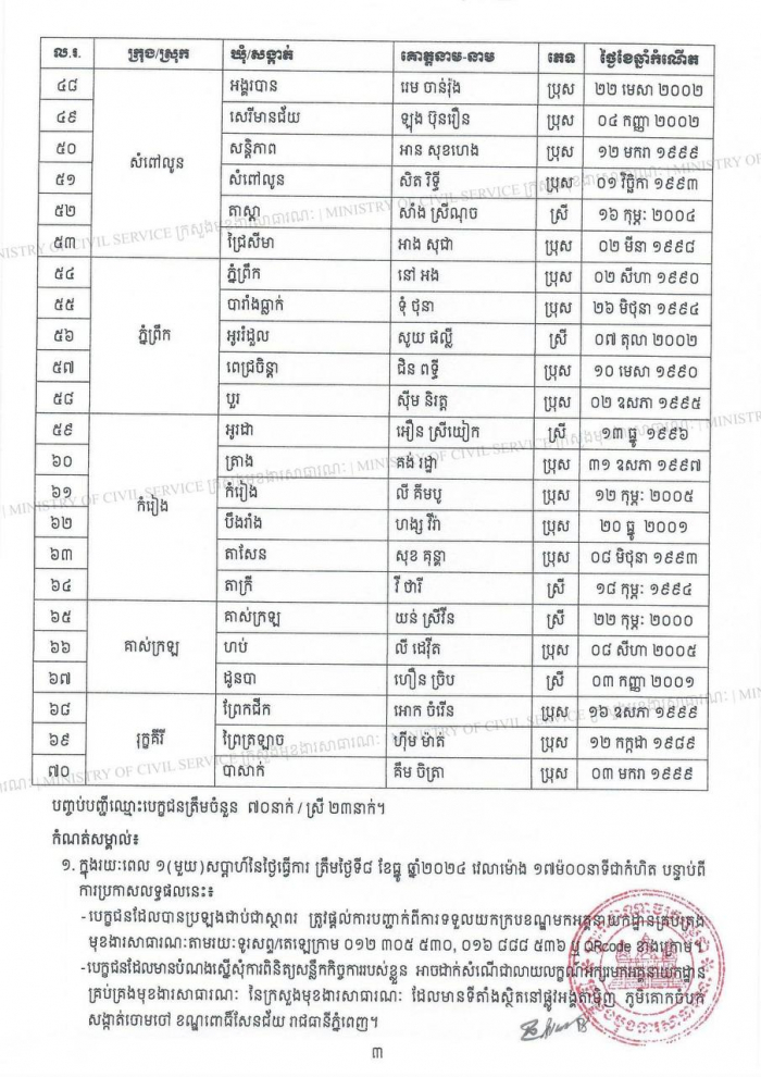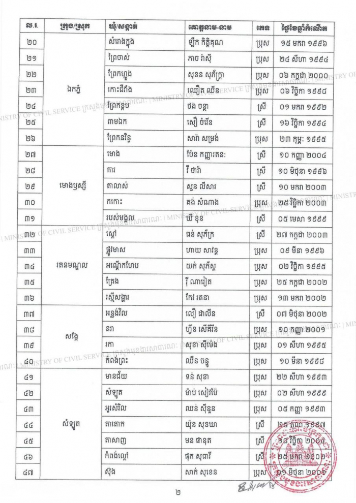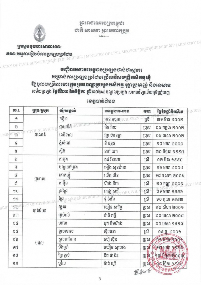 បញ្ជីរាយនាម បេក្ខជនប្រឡងជាប់ជាស្ថាពរនៃការប្រឡងប្រជែងជ្រើសរើសមន្ត្រីកសិកម្មឃុំ ឱ្យចូលបម្រើការងារក្នុងក្របខណ្ឌក្រសួងកសិកម្ម រុក្ខាប្រមាញ់ និងនេសាទ ខេត្តបាត់ដំបង