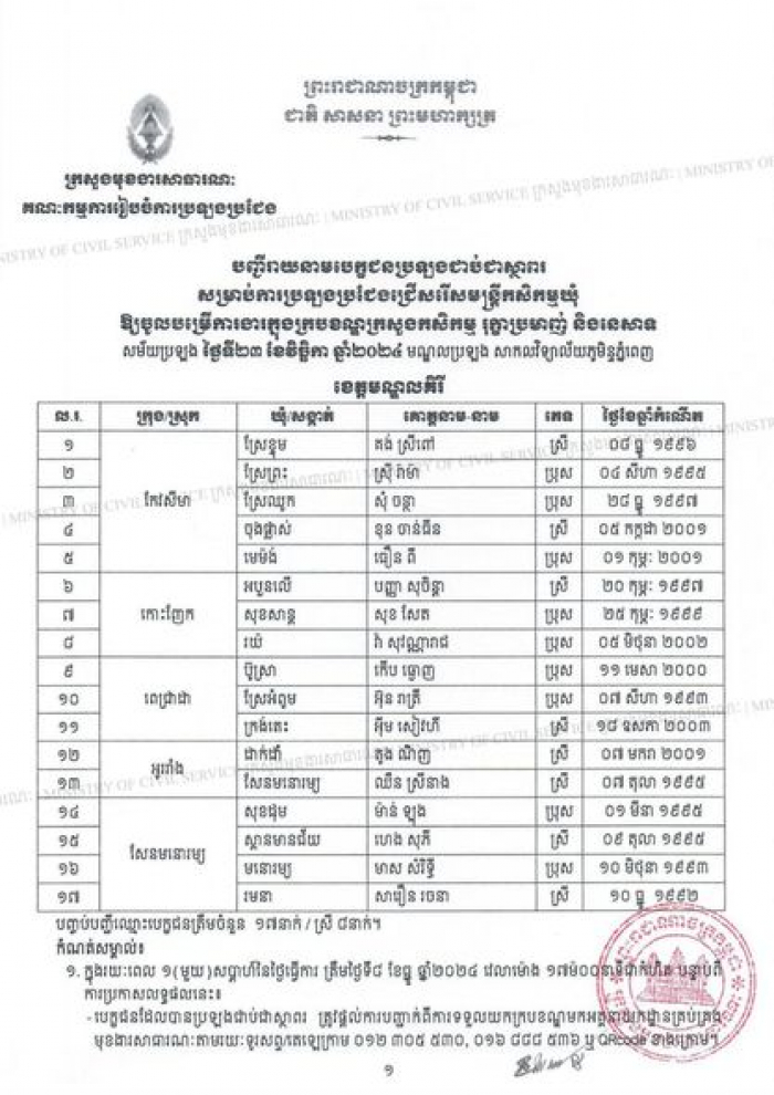 បញ្ជីរាយនាម បេក្ខជនប្រឡងជាប់ជាស្ថាពរនៃការប្រឡងប្រជែងជ្រើសរើសមន្ត្រីកសិកម្មឃុំ ឱ្យចូលបម្រើការងារក្នុងក្របខណ្ឌក្រសួងកសិកម្ម រុក្ខាប្រមាញ់ និងនេសាទ ខេត្តមណ្ឌលគិរី