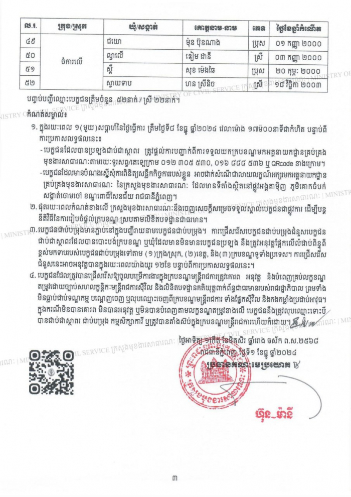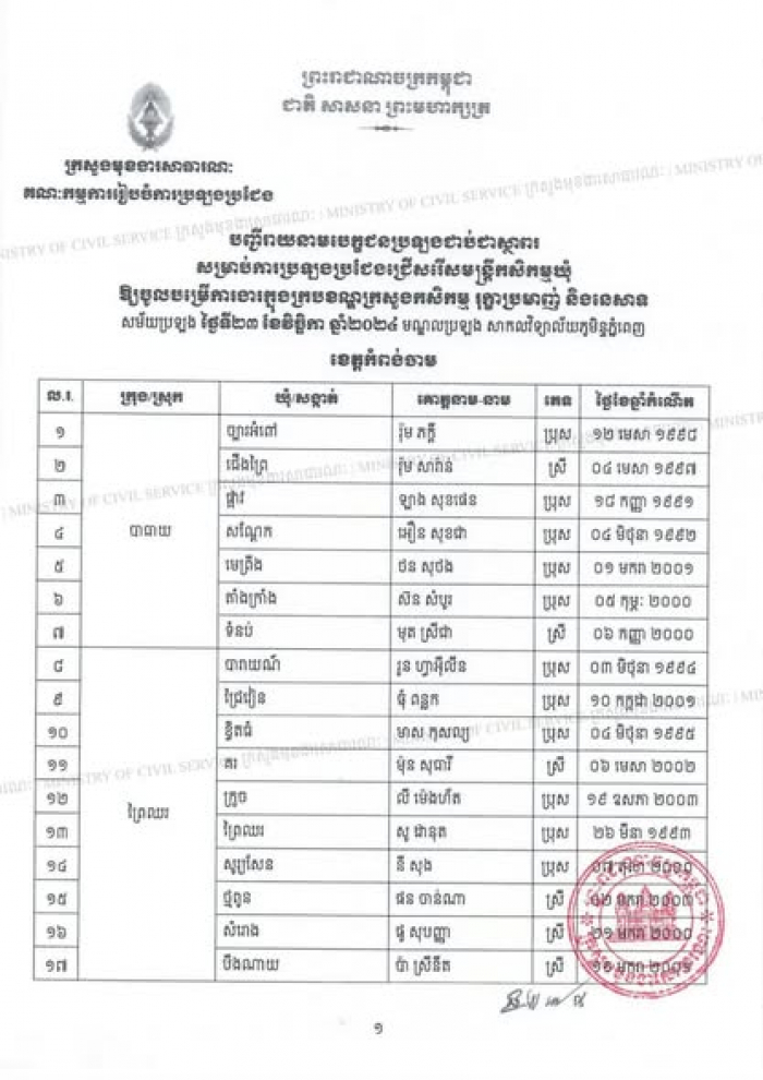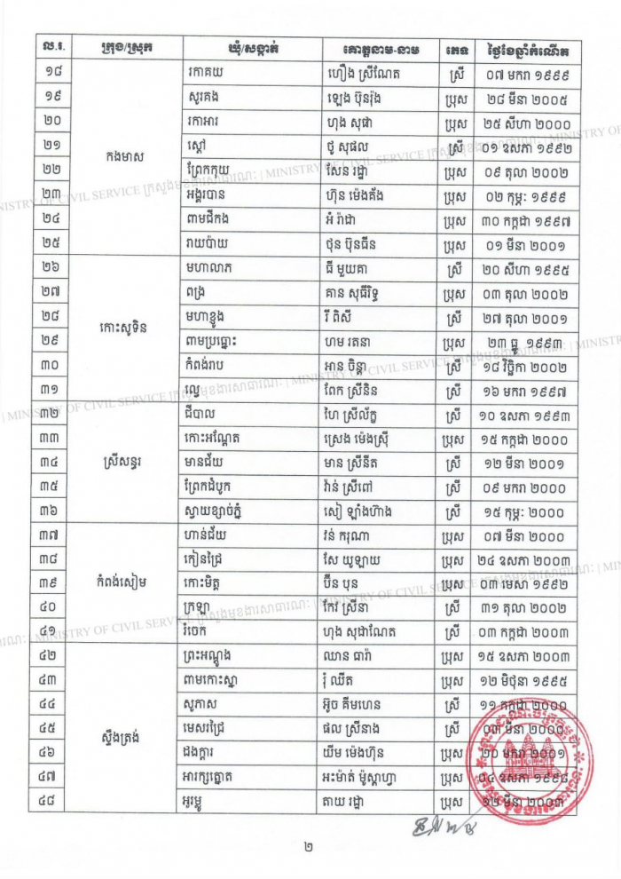 បញ្ជីរាយនាម បេក្ខជនប្រឡងជាប់ជាស្ថាពរនៃការប្រឡងប្រជែងជ្រើសរើសមន្ត្រីកសិកម្មឃុំ ឱ្យចូលបម្រើការងារក្នុងក្របខណ្ឌក្រសួងកសិកម្ម រុក្ខាប្រមាញ់ និងនេសាទ ខេត្តកំពង់ចាម