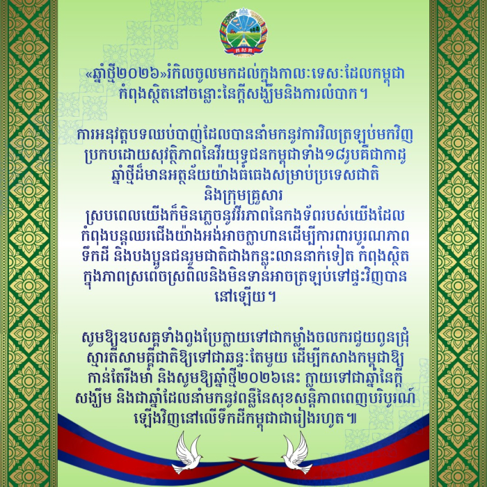 សូមឱ្យឧបសគ្គទាំងពួងប្រែក្លាយទៅជាកម្លាំងចលករជួយពូនជ្រុំស្មារតីសាមគ្គីជាតិឱ្យទៅជាឆន្ទៈតែមួយ ដើម្បីកសាងកម្ពុជាឱ្យកាន់តែរឹងមាំ និងសូមឱ្យឆ្នាំថ្មី២០២៦នេះ ក្លាយទៅជាឆ្នាំនៃក្តីសង្ឃឹម និងជាឆ្នាំដែលនាំមកនូវពន្លឺនៃសុខសន្តិភាពពេញបរិបូរណ៍ឡើងវិញនៅលើទឹកដីកម្ពុជាជារៀងរហូត៕