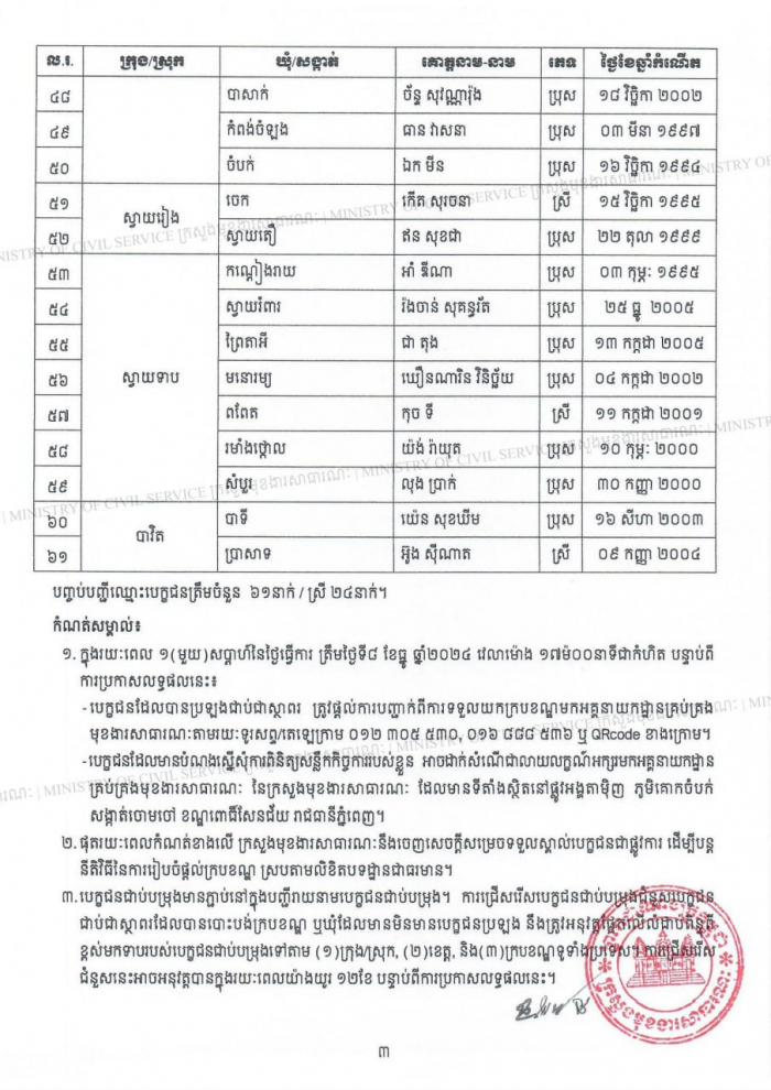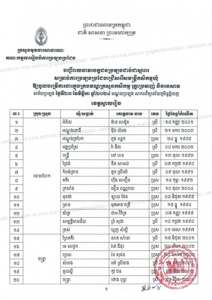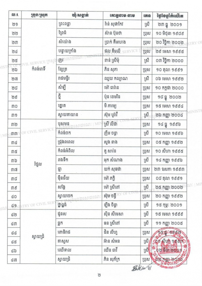 បញ្ជីរាយនាម បេក្ខជនប្រឡងជាប់ជាស្ថាពរនៃការប្រឡងប្រជែងជ្រើសរើសមន្ត្រីកសិកម្មឃុំ ឱ្យចូលបម្រើការងារក្នុងក្របខណ្ឌក្រសួងកសិកម្ម រុក្ខាប្រមាញ់ និងនេសាទ ខេត្តស្វាយរៀង