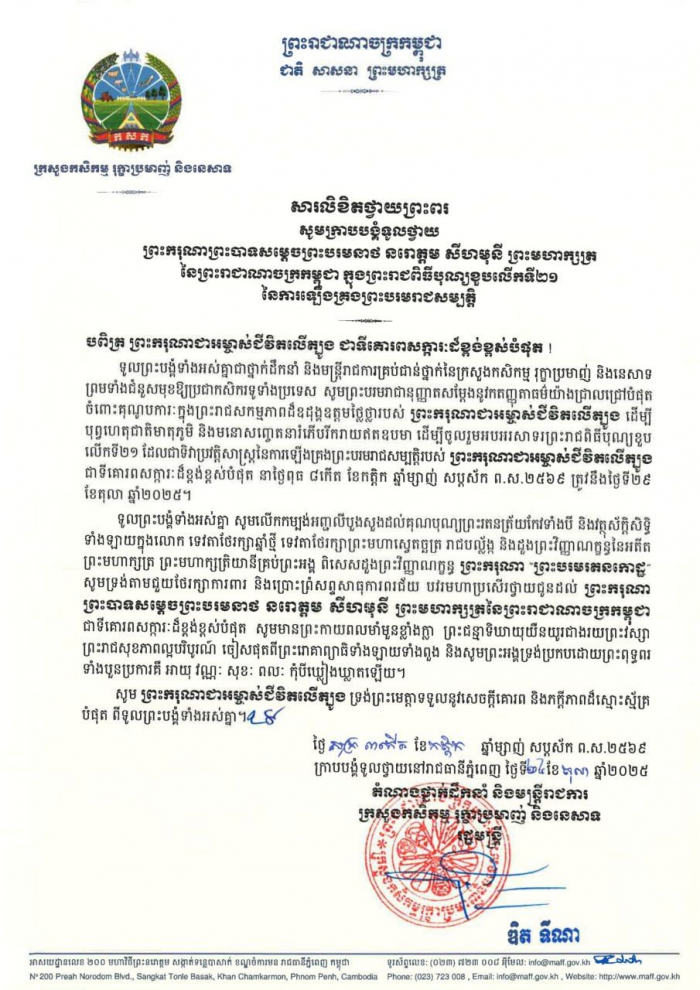 សារលិខិតថ្វាយព្រះពរ សូមក្រាបបង្គំទូលថ្វាយ ព្រះករុណាព្រះបាទសម្តេចព្រះបរមនាថ នរោត្តម សីហមុនី ព្រះមហាក្សត្រនៃព្រះរាជាណាចក្រកម្ពុជា ក្នុងព្រះរាជពិធីបុណ្យខួបលើកទី២១ នៃការឡើងគ្រងព្រះបរមរាជសម្បត្តិ