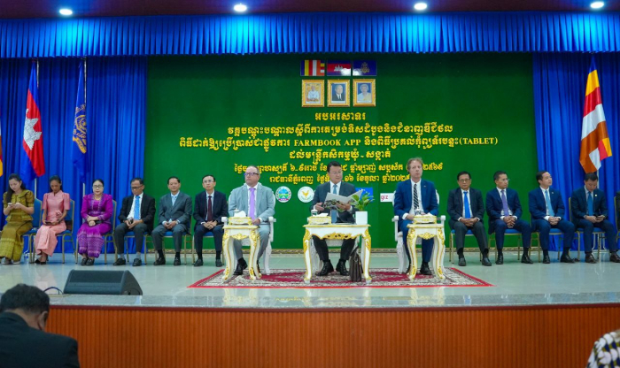 នាព្រឹកថ្ងៃទី១៣ ខែតុលា ឆ្នាំ២០២៥ ឯកឧត្តម ឌិត ទីណា រដ្ឋមន្រ្តីក្រសួងកសិកម្ម រុក្ខាប្រមាញ់ និងនេសាទ ឯកឧត្តម Igor Driesmans ឯកអគ្គរដ្ឋទូតសហភាពអឺរ៉ុបប្រចាំកម្ពុជា ឯកឧត្តម Stefan Messerer ឯកអគ្គរដ្ឋទូតអាល្លឺម៉ង់ប្រចាំកម្ពុជា និងឯកឧត្តមរដ្ឋលេខាធិការ​ គង់​ ម៉ារី​ តំណាងដ៏ខ្ពង់ខ្ពស់​ ឯកឧត្តមអគ្គបណ្ឌិតសភាចារ្យ អូន ព័ន្ធមុនីរ័ត្ន ឧបនាយករដ្ឋមន្ត្រី រដ្ឋមន្ត្រីក្រសួងសេដ្ឋកិច្ច និងហិរញ្ញវត្ថុបានអញ្ជេីញជាអធិបតីភាពក្នុងពិធីដាក់ឱ្យប្រេីប្រាស់ជាផ្លូវការ Farmbook App និងពិធីប្រគល់កុំព្យូទ័របន្ទះ (Tablet) ដល់មន្រ្តីកសិកម្មឃុំ-សង្កាត់ នៅសាកលវិទ្យាល័យភូមិន្ទកសិកម្ម។