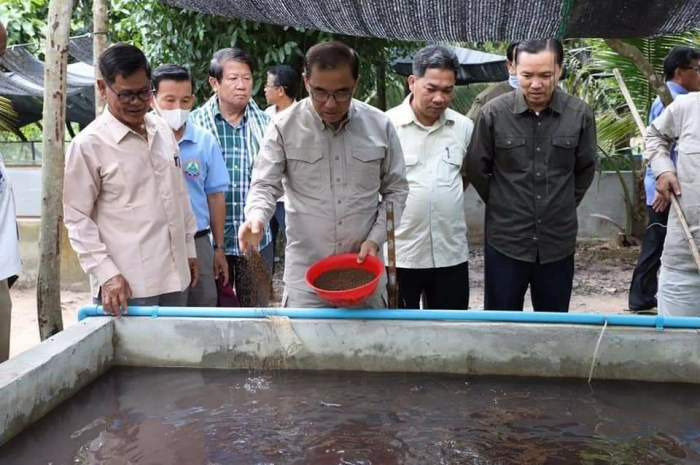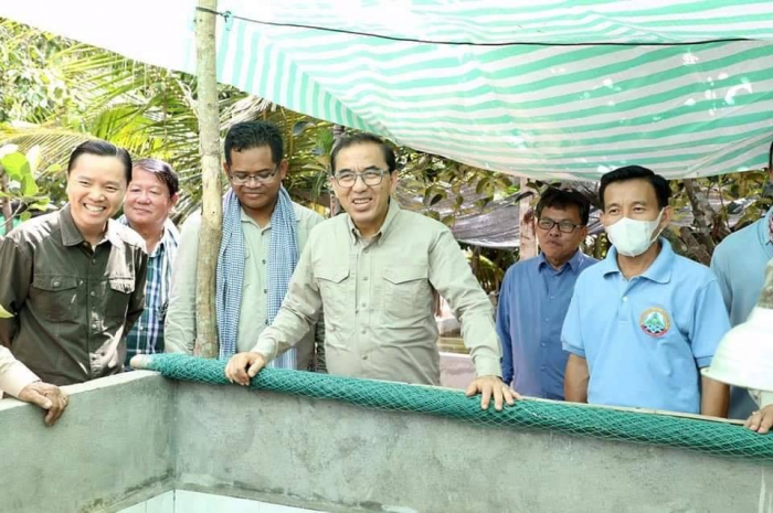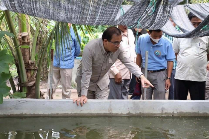 ឯកឧត្តមរដ្ឋមន្ត្រី និងសហការីបានអញ្ជើញបន្តដំណើរមកពិនិត្យកសិដ្ឋានចិញ្ចឹមត្រីអណ្តែង និងភ្ញាស់កង្កែប