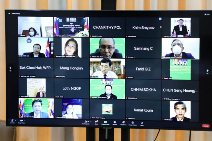 នៅទីស្តីការក្រសួង វេលាម៉ោង ៩:០០ នាព្រឹកថ្ងៃពុធ ៣កើត ខែស្រាពណ៍ ឆ្នាំឆ្លូវ ត្រីស័ក ព.ស. ២៥៦៥ ត្រូវនឹងថ្ងៃទី១១ ខែសីហា ឆ្នាំ២០២១ ឯកឧត្តម វេង សាខុន រដ្ឋមន្រ្តីក្រសួងកសិកម្ម រុក្ខាប្រមាញ់ និងនេសាទ និងជាអនុប្រធានក្រុមប្រឹក្សាស្ថារ អភិវឌ្ឍន៍វិស័យកសិកម្ម និងជនបទ ទទួលបន្ទុកសន្តិសុខស្បៀង និងអាហារូបត្ថម្ភ បានដឹកនាំកិច្ចប្រជុំតាមប្រព័ន្ធ Video Conference ជាមួយសមាជិកក្រុម ការងារបច្ចេកទេសចម្រុះ ដែលមាន ឯកឧត្តម លោកជំទាវតំណាងក្រសួង ស្ថាប័នពាក់ព័ន្ធចំនួន ១៣ និង ដៃគូអភិវឌ្ឍន៍មាន FAO, ADB, WB, WHO, WFP, GIZ, UNICEF បានចូលរួម ។ កិច្ចប្រជុំមានគោល បំណងពិនិត្យ និងវាយតម្លៃលើខ្លឹមសារសេចក្តីព្រាងចុងក្រោយនៃផែនទីបង្ហាញផ្លូវស្តីពីប្រព័ន្ធស្បៀងប្រកបដោយចីរភាពនៅកម្ពុជាឆ្នាំ២០៣០។