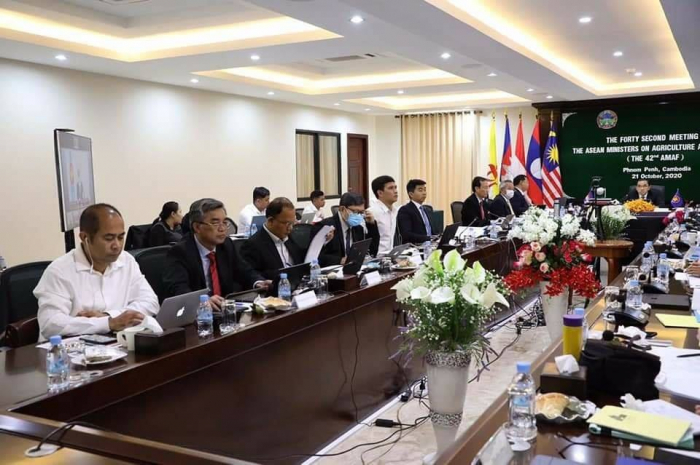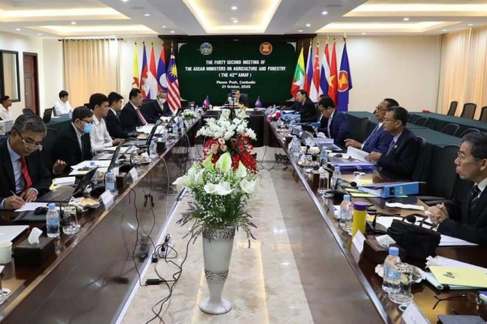 ដោយទទួលបានគោលការណ៍ការអនុញ្ញាតពីរាជរដ្ឋាភិបាល នៅថ្ងៃពុធ ៥កើត ខែកត្តិក ឆ្នាំជូត ទោស័ក ..២៥៦៤ ត្រូវនឹងថ្ងៃទី២១ ខែតុលា ឆ្នាំ២០២០ ឯកឧត្តម វេង សាខុន រដ្ឋមន្រ្តីក្រសួងកសិកម្ម រុក្ខាប្រមាញ់ និងនេសាទ បានដឹកនាំកិច្ចប្រជុំធំៗចំនួន៣ក្នុក្របខ័ណ្ឌអាស៊ានពីចម្ងាយតាមប្រព័ន្ធវីដេអូ គឺ . កិច្ចប្រជុំលើកទី៤២ រដ្ឋមន្រ្តីកសិកម្ម និងព្រៃឈើអាស៊ាន . កិច្ចប្រជុំលើកទី២០ រដ្ឋមន្រ្តីកសិកម្ម និងព្រៃឈើអាស៊ាននិងប្រទេសបូក៣ (ចិន កូរ៉េ និងជប៉ុន) និង . កិច្ចប្រជុំលើកទី៦  រដ្ឋមន្រ្តីកសិកម្ម និងព្រៃឈើអាស៊ាន ឥណ្ឌា។