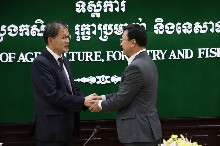 នារសៀលថ្ងៃទី១៤ ខែមីនា ឆ្នាំ២០២៣នេះដែរ ឯកឧត្តម ឌិត ទីណា រដ្ឋមន្ត្រីក្រសួងកសិកម្ម រុក្ខាប្រមាញ់ និងនេសាទ បានទទួលជួបសម្តែងការគួរសម និងពិភាក្សាការងារជាមួយលោកបណ្ឌិត Park Chongho នាយកប្រតិបត្តិនៃអង្គការសហប្រតិបត្តិការព្រៃឈើអាស៊ី (AFoCO) នៅទីស្ដីការក្រសួងកសិកម្ម រុក្ខាប្រមាញ់ និងនេសាទ។