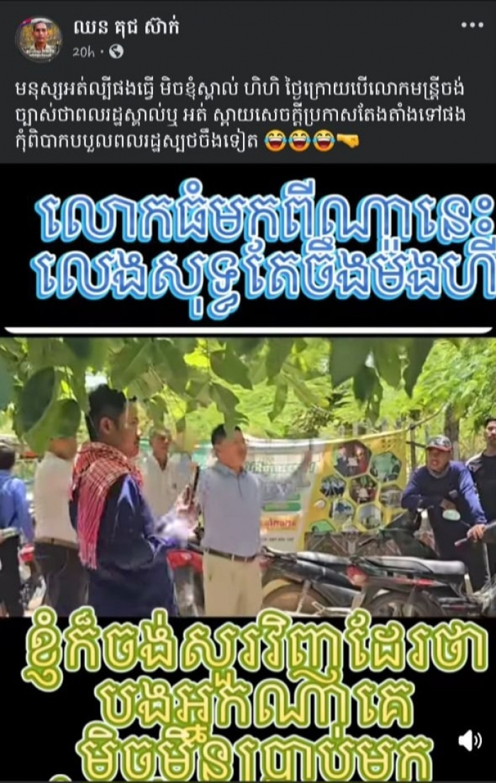ថ្មីៗនេះមានខ្លីបវីដេអូបង្ហោះតាមបណ្ដាញសង្គមសរសេរបែបចំអក និងឌឺដង ថា«សម្តីរបស់ឯកឧត្តមរដ្ឋមន្ត្រីកសិកម្មខេត្តបាត់ដំបង»