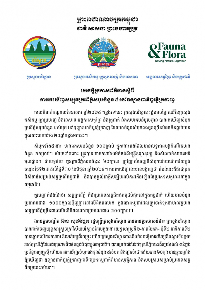 សេចក្តីប្រកាសព័ត៌មានស្តីពី ការរកឃើញសម្បុកក្រពើភ្នំសរុបចំនួន ៥ នៅឧទ្យានជាតិជួរភ្នំក្រវាញ
