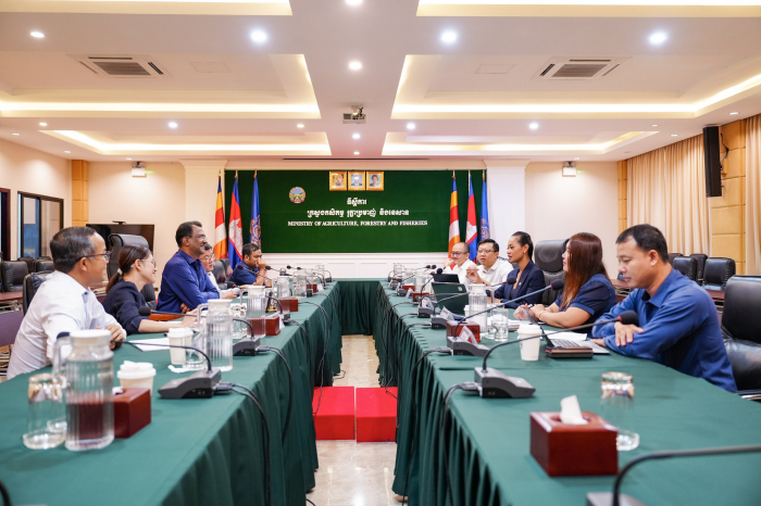 នៅថ្ងៃទី០៧ ខែមិថុនា ឆ្នាំ២០២៤នេះ លោកជំទាវ អ៊ឹម រចនា អនុរដ្ឋលេខាធិការ និងជាអ្នកនាំពាក្យ ក្រសួងកសិកម្ម រុក្ខាប្រមាញ់ និងនេសាទ បានដឹកនាំកិច្ចប្រជុំជាមួយប្រធានទីប្រឹក្សាបច្ចេកទេស នៃអង្គការអភិវឌ្ឍន៍ឧស្សាហកម្មសហប្រជាជាតិ ហៅកាត់ថា (UNIDO) លោកបណ្ឌិត Shetty Seetharama THOMBATHU និងមន្ត្រីបច្ចេកទេស។ នេះជាកិច្ចប្រជុំទី២ហើយ រវាងក្រុមការងារព័ត៌មាននៃក្រសួងកសិកម្ម រុក្ខាប្រមាញ់ និងនេសាទ ជាមួយអង្គការ UNIDO ដើម្បីរៀបចំដឹកនាំអ្នកសារព័ត៌មានទៅទស្សនកិច្ចសិក្សា នៅសហគ្រាសកែច្នៃផលិតផលជលផលសមុទ្រ តាមបណ្ដាខេត្តជាប់មាត់សមុទ្ររបស់កម្ពុជា នាពាក់កណ្តាលខែកក្កដា ឆ្នាំ២០២៤ខាងមុខនេះ។