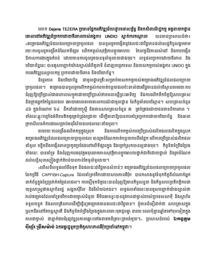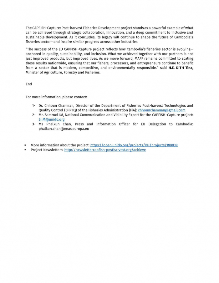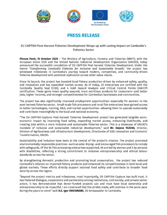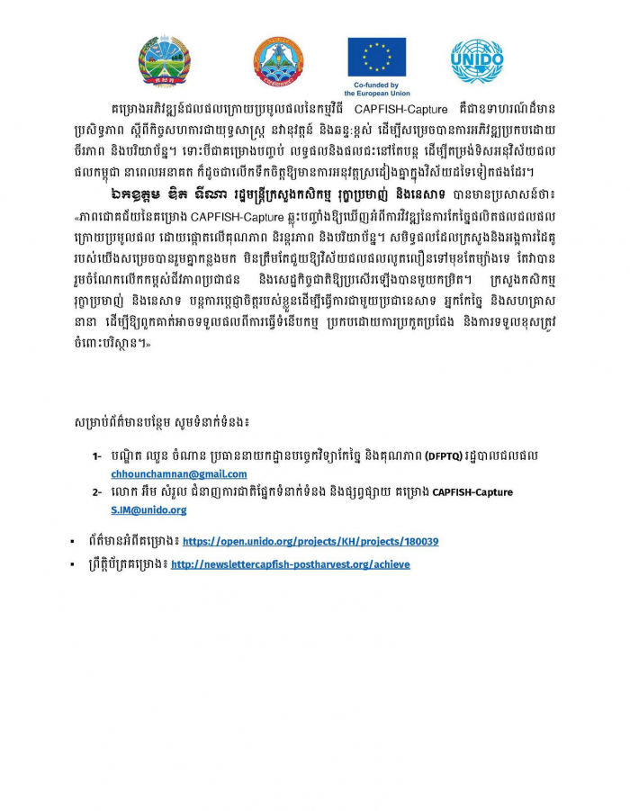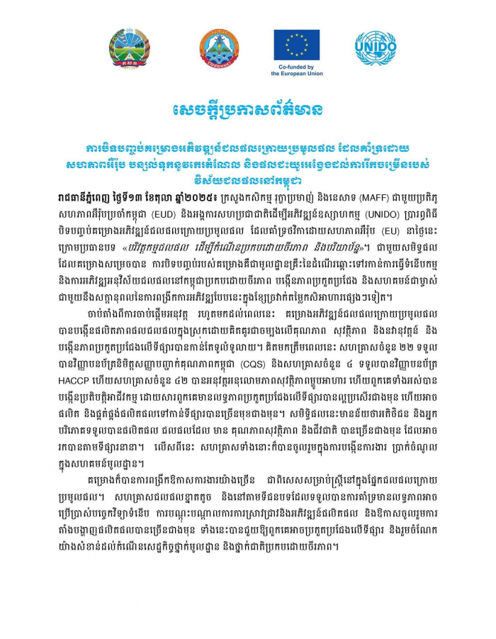 សេចក្តីប្រកាសព័ត៌មាន ការបិទបញ្ចប់គម្រោងអភិវឌ្ឍន៍ជលផលក្រោយប្រមូលផល ដែលគាំទ្រដោយ សហភាពអឺរ៉ុប បន្សល់ទុកនូវកេរតំណែល និងផលជះយូរអង្វែងដល់ការរីកចម្រើនរបស់វិស័យជលផលនៅកម្ពុជា