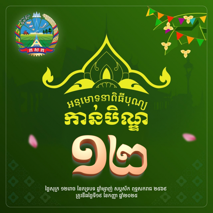 សូមអនុមោទនា ពិធីកាន់បិណ្ឌ ១២ ថ្ងៃសុក្រ ១២រោច ខែភទ្របទ ឆ្នាំម្សាញ់ សប្តស័ក ពុទ្ធសករាជ ២៥៦៩ ត្រូវនឹងថ្ងៃទី១៩ ខែកញ្ញា ឆ្នាំ២០២៥