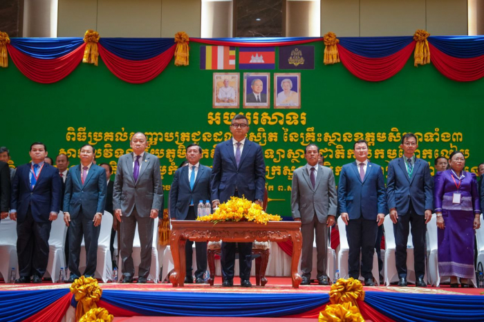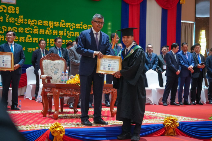 នាព្រឹកថ្ងៃទី១៦ ខែកញ្ញា ឆ្នាំ២០២៥​ ឯកឧត្តមបណ្ឌិតសភាចារ្យ​ ហង់ជួន​ ណារ៉ុន​ ឧបនាយករដ្ឋមន្រ្តី​ រដ្ឋមន្រ្តី​ក្រសួងអប់រំ​ យុវជន​ និងកីឡា​ និងជាតំណាងដ៏ខ្ពង់ខ្ពស់​ សម្តេចមហាបវរធិបតី​ ហ៊ុន​ ម៉ាណែត​ នាយករដ្ឋមន្រ្តី​នៃព្រះរាជាណាចក្រកម្ពុជា​ បានអញ្ជើញជាអធិបតីភាពដ៏ខ្ពង់ខ្ពស់ក្នុងពិធីប្រគល់សញ្ញាបត្រជូនដល់និស្សិតជ័យលាភី នៃសាកលវិទ្យាល័យភូមិន្ទកសិកម្ម​ វិទ្យាស្ថានជាតិកសិកម្មព្រែកលៀប និងវិទ្យាស្ថានជាតិកសិកម្មកំពង់ចាម នៅមជ្ឈមណ្ឌលកោះពេជ្រ។