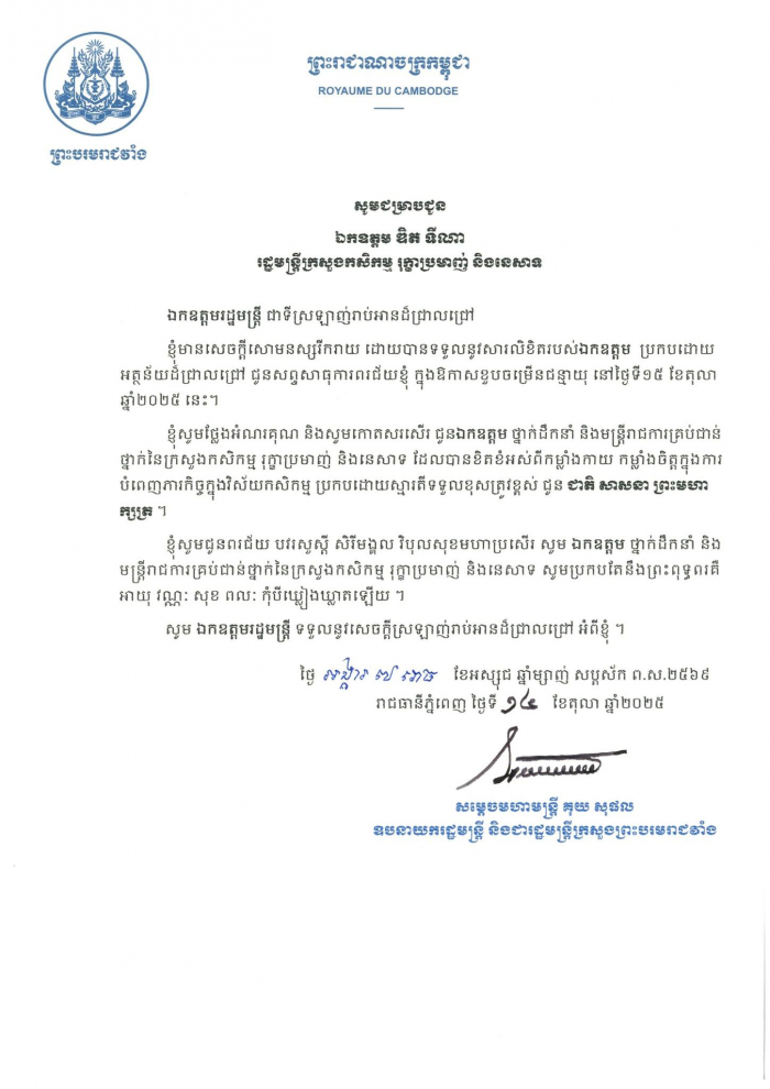 សម្តេចមហាមន្រ្តី គុយ សុផល ឧបនាយករដ្ឋមន្រ្តី និងជារដ្ឋមន្រ្តីក្រសួងព្រះបរមរាជវាំង បានផ្ញើលិខិតថ្លែងអំណរគុណ ឯកឧត្តម ឌិត ទីណា រដ្ឋមន្ត្រីក្រសួងកសិកម្ម រុក្ខាប្រមាញ់ និងនេសាទ ក្នុងឱកាសដែល ឯកឧត្តមរដ្ឋមន្ត្រី បានផ្ញើលិខិតអបអរសាទរជូន សម្តេចមហាមន្រ្តី គុយ សុផល ឧបនាយករដ្ឋមន្រ្តី ក្នុងឱកាសខួបចម្រេីនជន្មាយុ នៅថ្ងៃទី១៥ ខែតុលា ឆ្នាំ២០២៥៕