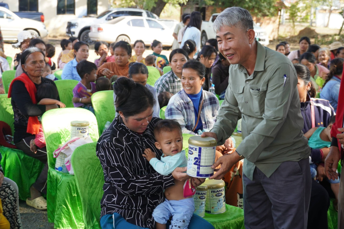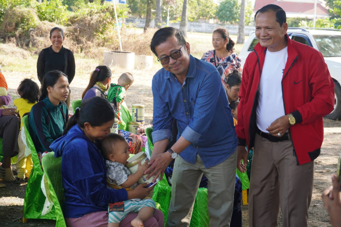 នារសៀលថ្ងៃទី៣ ខែធ្នូ ឆ្នាំ២០២៥ ឯកឧត្តម អ៊ឺម ស៊ីថុល រដ្ឋលេខាធិការប្រចាំការក្រសួងកសិកម្ម រុក្ខាប្រមាញ់ និងនេសាទ និងជាប្រធានក្រុមការងាររាជរដ្ឋាភិបាលចុះមូលដ្ឋានស្រុកស្វាយចេក ខេត្តបន្ទាយមានជ័យ បានបន្តអញ្ជេីញជាអធិបតីភាពក្នុងពិធីចែកទឹកដោះគោកំប៉ុងដល់កុមារដែលមានអាយុចាប់ពី៦ខែដល់១២ខែ ដែលជាអំណោយរបស់លោក ហេង ប៊ុនឆាយ និងលោកស្រី ដោយមានការចូលរួមពីឯកឧត្តម វ៉ា ពិសី អនុរដ្ឋលេខាធិការ លោក ដា ទឹង ប្រធានក្រុមប្រឹក្សាស្រុកស្វាយចេក លោក លឿង សុភក្តិ អភិបាលនៃគណៈអភិបាលស្រុកស្វាយចេក តំណាងរដ្ឋបាលព្រៃឈើនៃក្រសួងកសិកម្ម រុក្ខាប្រមាញ់ និងនេសាទ ក្រុមការងាររាជរដ្ឋាភិបាលចុះមូលដ្ឋានឃុំទាំង៨នៃស្រុកស្វាយចេក និងប្រជាពលរដ្ឋសរុបប្រមាណ១០០នាក់៕