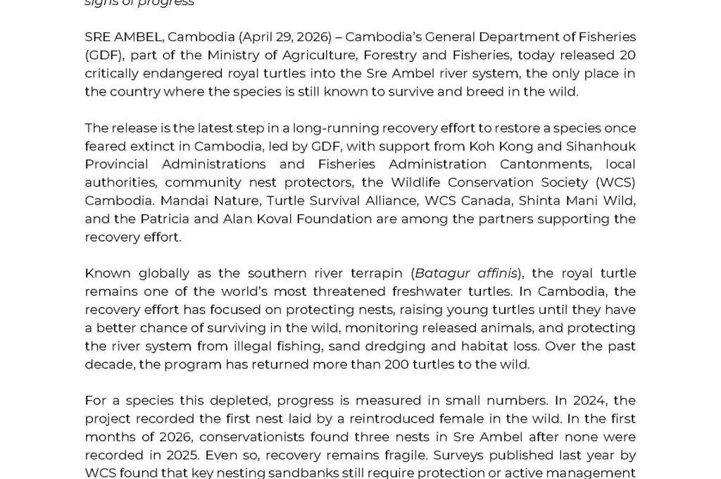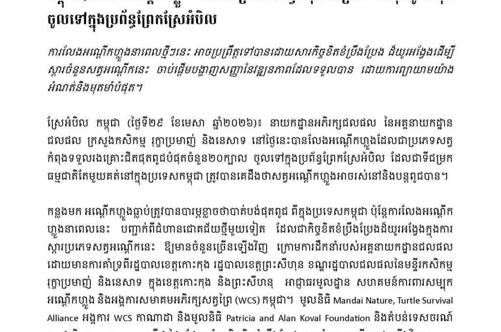 កម្ពុជាបានលែងអណ្តើកហ្លួង ដែលជាប្រភេទសត្វ កំពុងរងគ្រោះជិតផុតពូជ បំផុត ចូលទៅក្នុងប្រព័ន្ធព្រែកស្រែអំបិល។