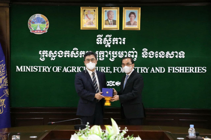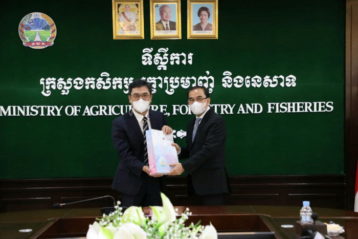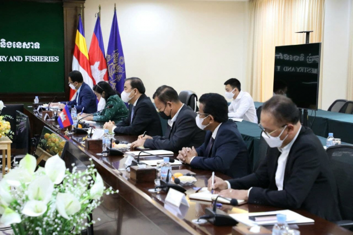 នៅទីស្តីការក្រសួងកសិកម្ម រុក្ខាប្រមាញ់ និងនេសាទ នាវេលាម៉ោង ៩:០០ ព្រឹក ថ្ងៃទី១១ ខែវិច្ឆិកា ឆ្នាំ២០២១ ឯកឧត្តមរដ្ឋមន្ត្រី វេង សាខុន និងសហការីបានអញ្ជើញចូលរួមពិភាក្សាការងារជាមួយ លោក Hyunjun Rho នាយកប្រតិបត្តិនៃ KOICA និង លោក Cho Jaejin នាយកប្រតិបត្តិនៃ Korea Agency of HACCP Accreditation and Services ហើយនិងសហការី   ដើម្បីពិនិត្យពិភាក្សាលើការសិក្សារៀបចំគម្រោងផ្តល់ជំនួយលើការពង្រឹងសមត្ថភាព សុវត្ថិភាពសាច់សត្វ សុខភាពសត្វ និងផលិតកម្មសត្វ ហើយនិងកសាងមន្ទីរពិសោធន៍ជាតិសម្រាប់ត្រួតពិនិត្យគុណភាពសត្វ ផលិតផលបសុសត្វនៅកម្ពុជា។