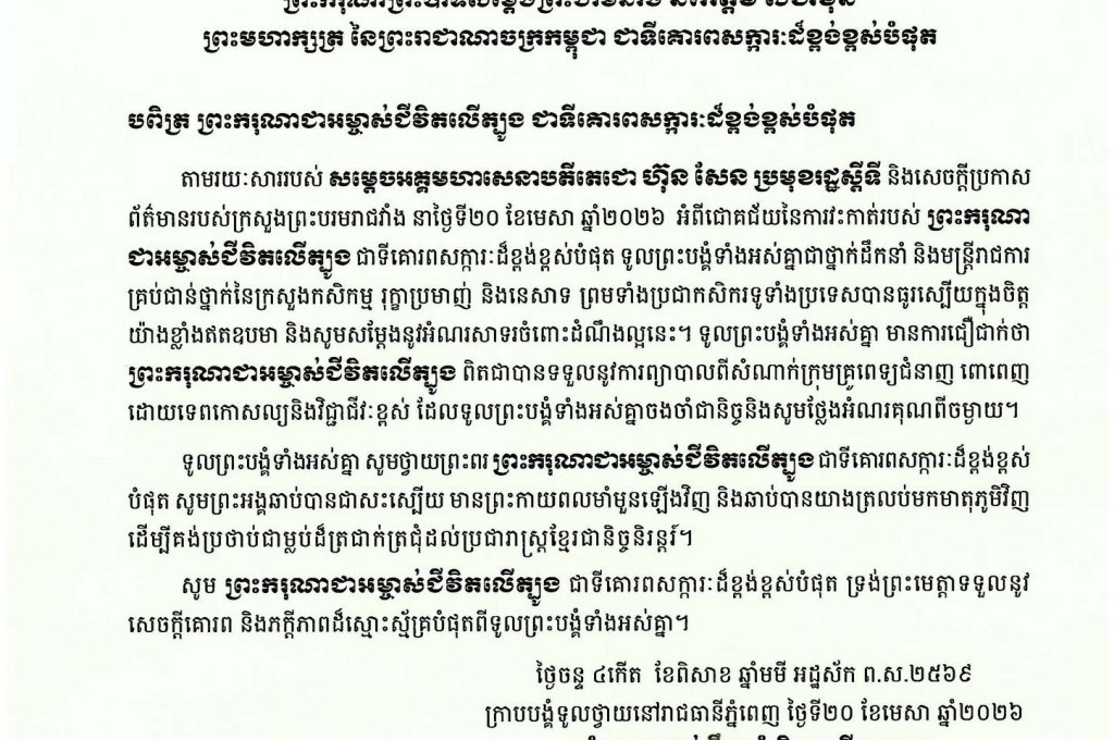 ទូលព្រះបង្គំទាំងអស់គ្នា សូមសម្តែងនូវអំណរសាទរយ៉ាងជ្រាលជ្រៅ និងសូមថ្វាយព្រះពរព្រះអង្គ សូមទ្រង់ឆាប់បានជាសះស្បើយ មានព្រះកាយពលមាំមួន និងឆាប់បានយាងត្រលប់មកមាតុភូមិវិញ ដើម្បីគង់ប្រថាប់ជាម្លប់ដ៏ត្រជាក់ត្រជុំដល់ប្រជារាស្ត្រខ្មែរជានិច្ចនិរន្តរ៍៕