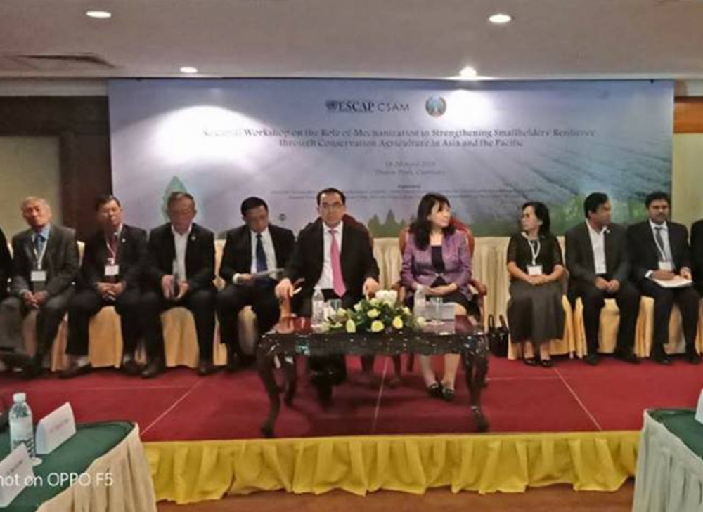 សណ្ឋាគារសាន់វ៉េ ព្រឹកថ្ងៃពុធ ៤កើត ខែពិសាខ ឆ្នាំច សំរឹទ្ធស័ក ព.ស ២៥៦២ ត្រូវនឹងថ្ងៃទី១៨ ខែមេសា ឆ្នាំ២០១៨ ឯកឧត្តម វេង សាខុន រដ្ឋមន្រ្តីក្រសួងកសិកម្ម រុក្ខាប្រមាញ់ និងនេសាទ បានអញ្ជើញជាអធិបតីក្នុងឱកាសបើកសិក្ខាសាលាថ្នាក់តំបន់ស្តីពីតួនាទីគ្រឿងយន្តកសិកម្មក្នុងការពង្រឹងភាពបន្សាំរបស់កសិករខ្នាតតូចដោយប្រើប្រាស់បច្ចេកទេសដើម្បីអភិរក្សកសិកម្ម ក្នុងតំបន់អាស៊ីនិងប៉ាស៊ីហ្វិក ដែលសហការរៀបចំដោយនាយកដ្ឋានគ្រឿងយន្តកសិកម្មនៃអគ្គនាយកដ្ឋានកសិកម្ម និងមជ្ឈមណ្ឌលគ្រឿងយន្តកសិកម្មសមស្របរបស់គណៈកម្មការសេដ្ឋកិច្ចនិងសង្គមសម្រាប់តំបន់អាស៊ីនិងប៉ាស៊ីហ្វិកនៃអង្គការសហប្រជាជាតិ (UN-ESCAP) មានរយៈពេល៣ថ្ងៃ។ សិក្ខាសាលានេះមានការអញ្ជើញចូលរួមពីប្រទេសជាសមាជិកនិងដៃគូអភិវឌ្ឍយ៉ាងច្រើនកុះករ។