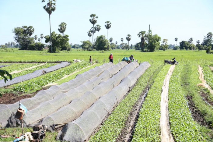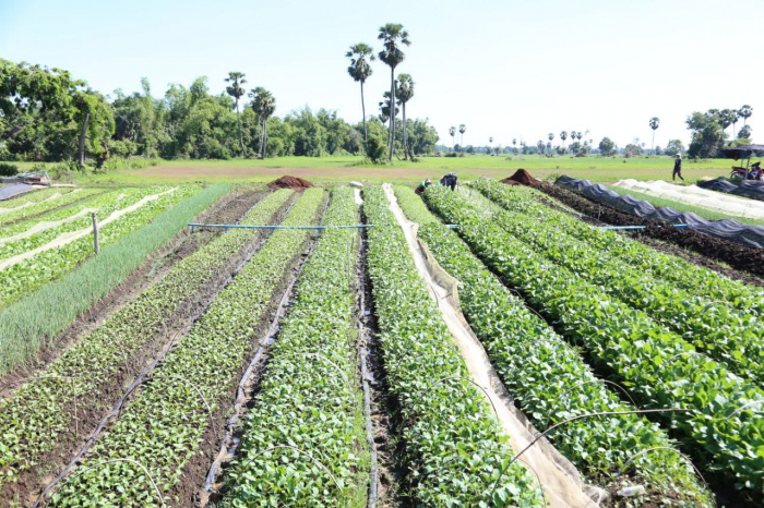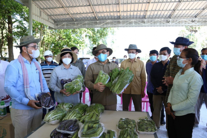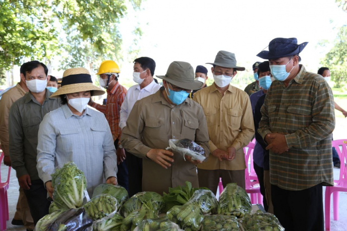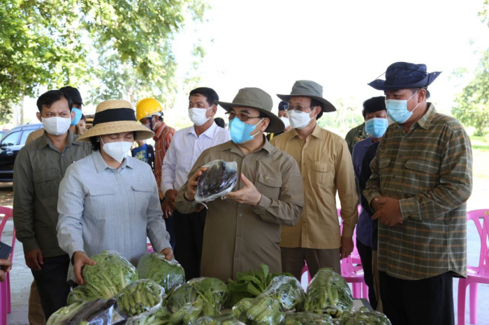 ពិនិត្យឃើញដំណាំបន្លែកំពុងរីកលូតលាស់ ទទួលបានផល ឯកឧត្តមរដ្ឋមន្ត្រីបានកោតសរសើរ និងវាយតម្លៃចំពោះការខិតខំប្រឹងប្រែងរបស់ប្រជាសហគមន៍ទាំង ៦៥គ្រួសារ ប្រកាន់ យករបរដាំបន្លែ ជាការងារស្នូលដើម្បីសេដ្ឋកិច្ចគ្រួសារ ដោយចាប់ផ្តើមពីប្រើកំលាំងរែកទឹកស្រោចបន្លែ ប៉ុន្តែបច្ចុប្បន្នសមាជិកដាំបន្លែដោយប្រើប្រព័ន្ធសាច ទុយោស្រោច និងដំណក់ស្រោចបន្លែជំនួសវិញ។ បច្ចេកទេសស្រោចស្រពដំណាំបន្លែនេះ ឯកឧត្តមរដ្ឋមន្ត្រីបានគូសបញ្ជាក់ថា ក្រសួងទាមទារចង់បាន មិនតែប៉ុណ្ណោះក៏គាំទ្រ ជំរុញ និងលើកទឹកចិត្តដល់ដៃគូអភិវឌ្ឍន៍ វិស័យឯកជន និងសហគមន៍បន្លែសុវត្ថិភាព និងសរីរាង្គ ចូលរួមទាំងអស់គ្នា ដើម្បីធ្វើបដិវត្តផលិតកម្មបន្លែកម្ពុជាឲ្យមានលក្ខណទំនើប ប្រើប្រាស់បច្ចេកវិទ្យាទាន់សម័យ បរិយាប័ន្ន និងការប្រែប្រួលអាកាសធាតុ ជាពិសេសឲ្យត្រូវតាមស្តង់ដារទីផ្សារគឺនិរន្តរភាពបរិមាណផ្គត់ផ្គង់ គុណភាព សុវត្ថិភាព និងតម្លៃ។