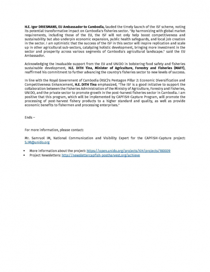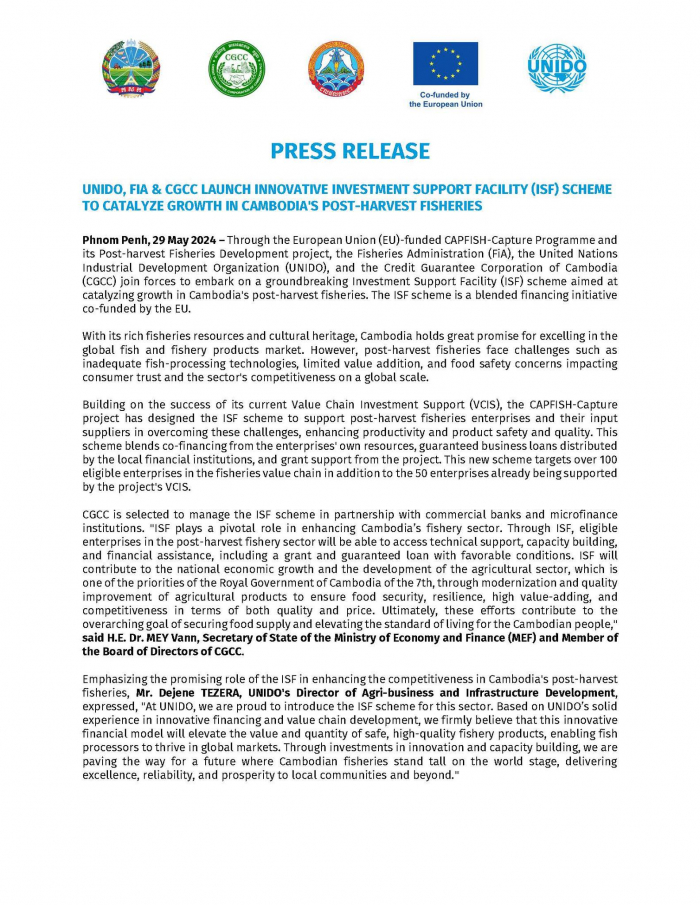 កម្មវិធីហិរញ្ញវត្ថុគាំទ្រការវិនិយោគ (ISF) ត្រូវបានដាក់ឱ្យដំណើរការដោយអង្គការ UNIDO រដ្ឋបាលជលផល និងសាជីវកម្មធានាឥណទានកម្ពុជា ដើម្បីជំរុញកំណើនក្នុងវិស័យជលផលក្រោយប្រមូលផលនៅកម្ពុជា