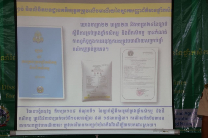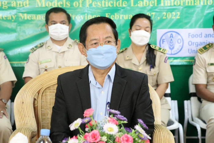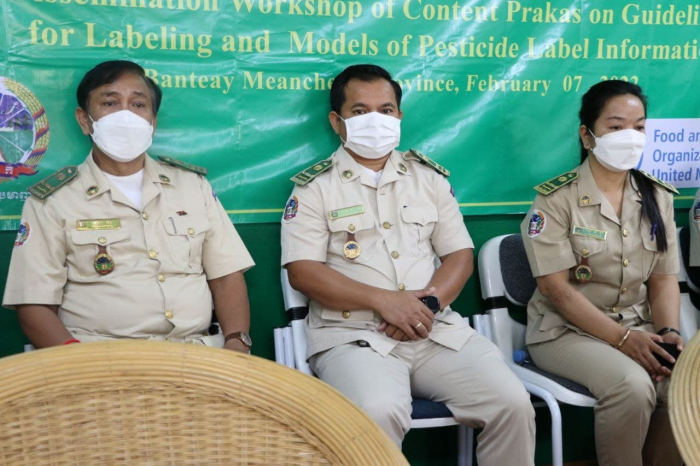 ក្រោមជំនួយឧបត្ថម្ភហិរញ្ញវត្ថុពីអង្គការស្បៀងអាហារ និងកសិកម្មនៃសហប្រជាជាតិ ( FAO ) និងទទួលបានការអនុញ្ញាតដ៍ខ្ពង់ខ្ពស់ពី ឯកឧត្តម វេង សាខុន រដ្ឋមន្ត្រីក្រសួងកសិកម្ម រុក្ខាប្រមាញ់និងនេសាទ ។ ព្រឹកថ្ងៃចន្ទ ៦កើត ខែមាឃ ឆ្នាំឆ្លូវ ត្រីស័កព.ស២៥៦៥ ត្រូវនឹងថ្ងៃទី០៧ ខែកុម្ភៈ ឆ្នាំ២០២២ នាយកដ្ឋាននីតិកម្មកសិកម្មនៃក្រសួងកសិកម្ម រុក្ខាប្រមាញ់ និងនេសាទ បានប្រារព្ធបើកសិក្ខាសាលាស្តីពីគោលការណ៍ណែនាំសម្រាប់ស្លាកសញ្ញាព័ត៌មាន និងគំរូស្លាកសញ្ញាព័ត៌មាននៃថ្នាំកសិកម្ម ។ ក្រោមអធិបតីភាព ឯកឧត្តម ឡោ រស្មី អនុរដ្ឋលេខាធិការក្រសួងកសិកម្មរុក្ខាប្រមាញ់និងនេសាទ លោក ភុំ រ៉ា ប្រធាននាយកដ្ឋាននីតិកម្មកសិកម្ម លោកអនុប្រធានមន្ទីរកសិកម្ម រុក្ខាប្រមាញ់ និងនេសាទ ខេត្តបន្ទាយមានជ័យ និងមានការចូលរួមពី ពាណិជ្ជករ អាជីវករ និងអ្នកពាក់ព័ន្ធប្រមាណ៨០នាក់ ដោយបានអនុវត្តតាមគោលការណ៍ ៣កុំ ៣ការពារ ។ កម្មវិធីនេះរៀបចំនៅមន្ទីរកសិកម្ម រុក្ខាប្រមាញ់ និងនេសាទ ខេត្តបន្ទាយមានជ័យ និងរៀបចំដោយនាយកដ្ឋាននីតិកម្មកសិកម្ម នៃក្រសួងកសិកម្ម រុក្ខាប្រមាញ់ និងនេសាទ សហការជាមួយអង្គការស្បៀងអាហារ និងកសិកម្មនៃសហប្រជាជាតិ ( FAO )