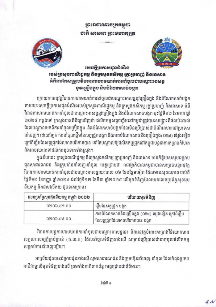 សេចក្តីប្រកាសជូនដំណឹងរួម រវាងក្រសួងពាណិជ្ជកម្ម និងក្រសួងកសិកម្ម រុក្ខាប្រមាញ់ និងនេសាទ អំពីការកែសម្រួលវិធានការហាមឃាត់ការនាំចូលជាបណ្តោះអាសន្ន នូវគ្រឿងក្នុង និងបំណែកសាច់បង្កក